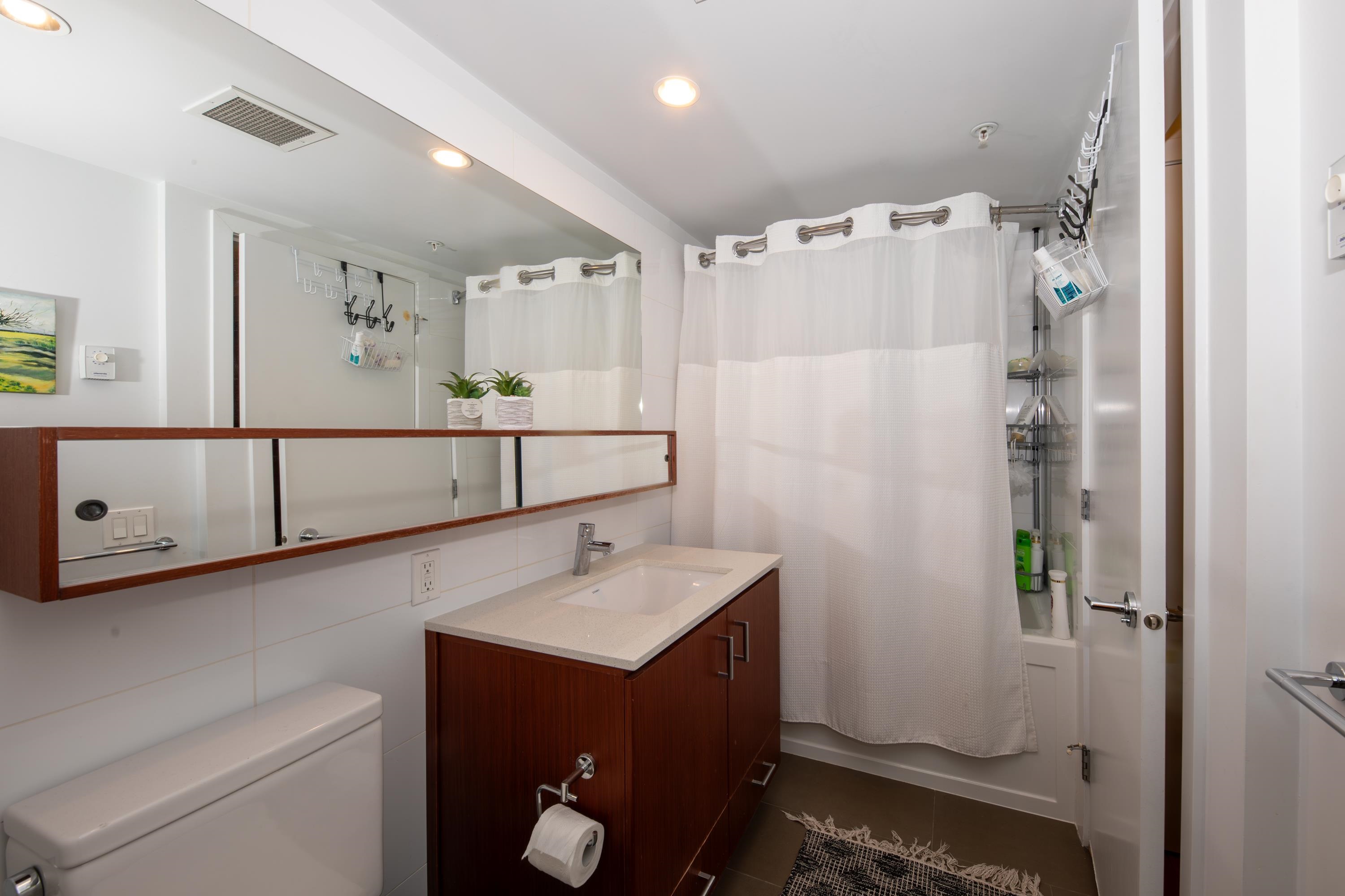 Luxury Condo in Lower Lonsdale! Live steps from Lonsdale Quay Market in this spacious 1-bedroom, 1-bath home with floor-to-ceiling windows and breathtaking North Shore views. The modern kitchen boasts quartz countertops, a large island, stainless steel appliances, and abundant storage, with additional built-ins at the entry and in the bedroom. A bright, open layout maximizes natural light, while the private deck and rooftop patio with BBQs, lounge, fire pit, and panoramic mountain and partial ocean views o...