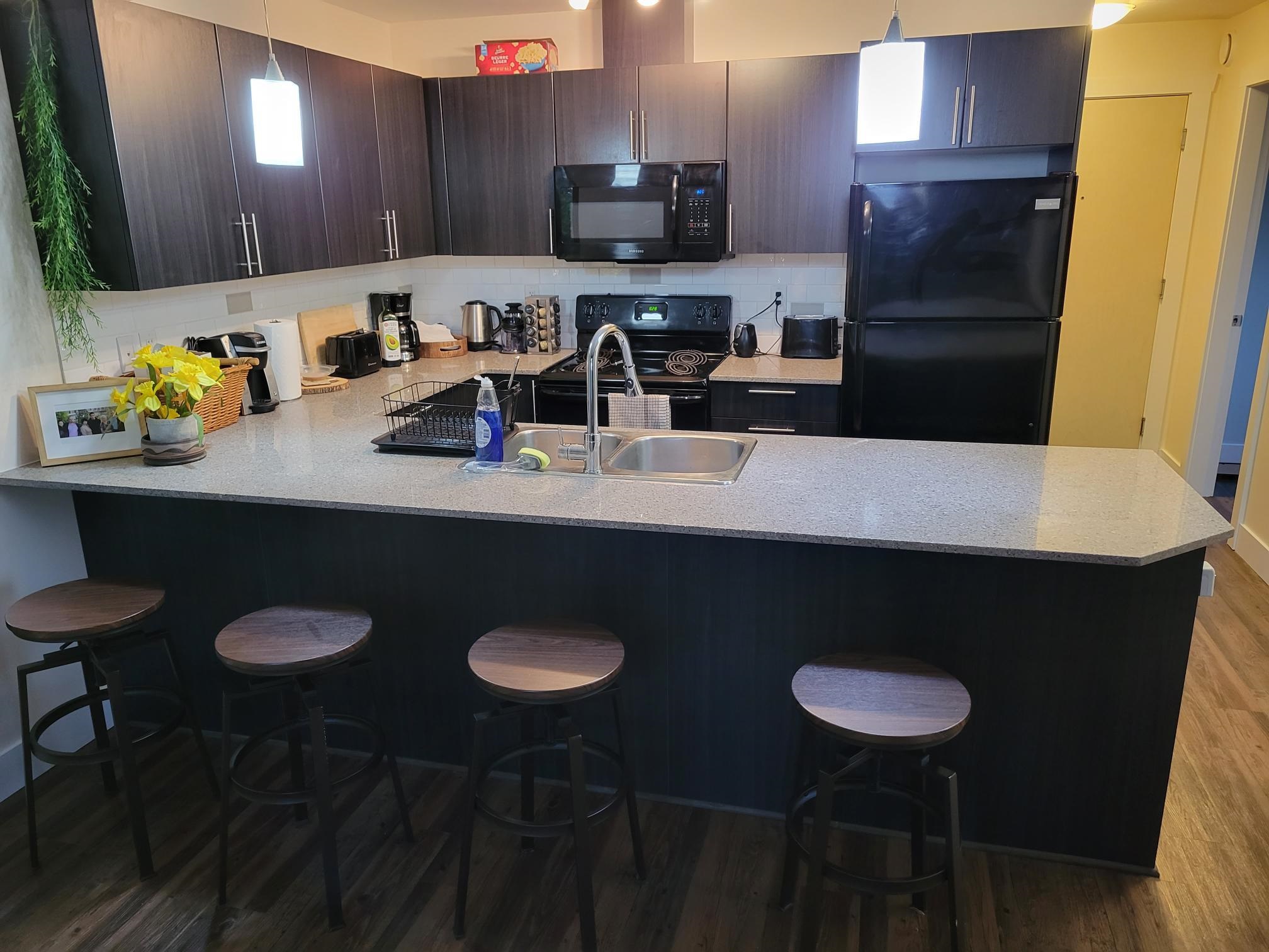 RARE!! TOP FLOOR PENTHOUSE CORNER UNIT WITH PEACEFUL & PRIVATE LOCATION!! You will Love the Bright Open Concept with 1 Bdrm & Den, Granite countertops, Laminate flooring, Freshly painted, New Custom Blinds & Washer & Dryer, Vaulted Ceilings in the Living Room and Beautiful Spacious Patio! Located just steps to Shopping, Boutiques, Fabulous Restaurants & easy access to Hwy 1. Pets & Rentals Allowed-1 Dog (No Size Restriction) or 2 Cats. BONUS!! Comes with 2 Secure Parking Stalls & Storage Locker!