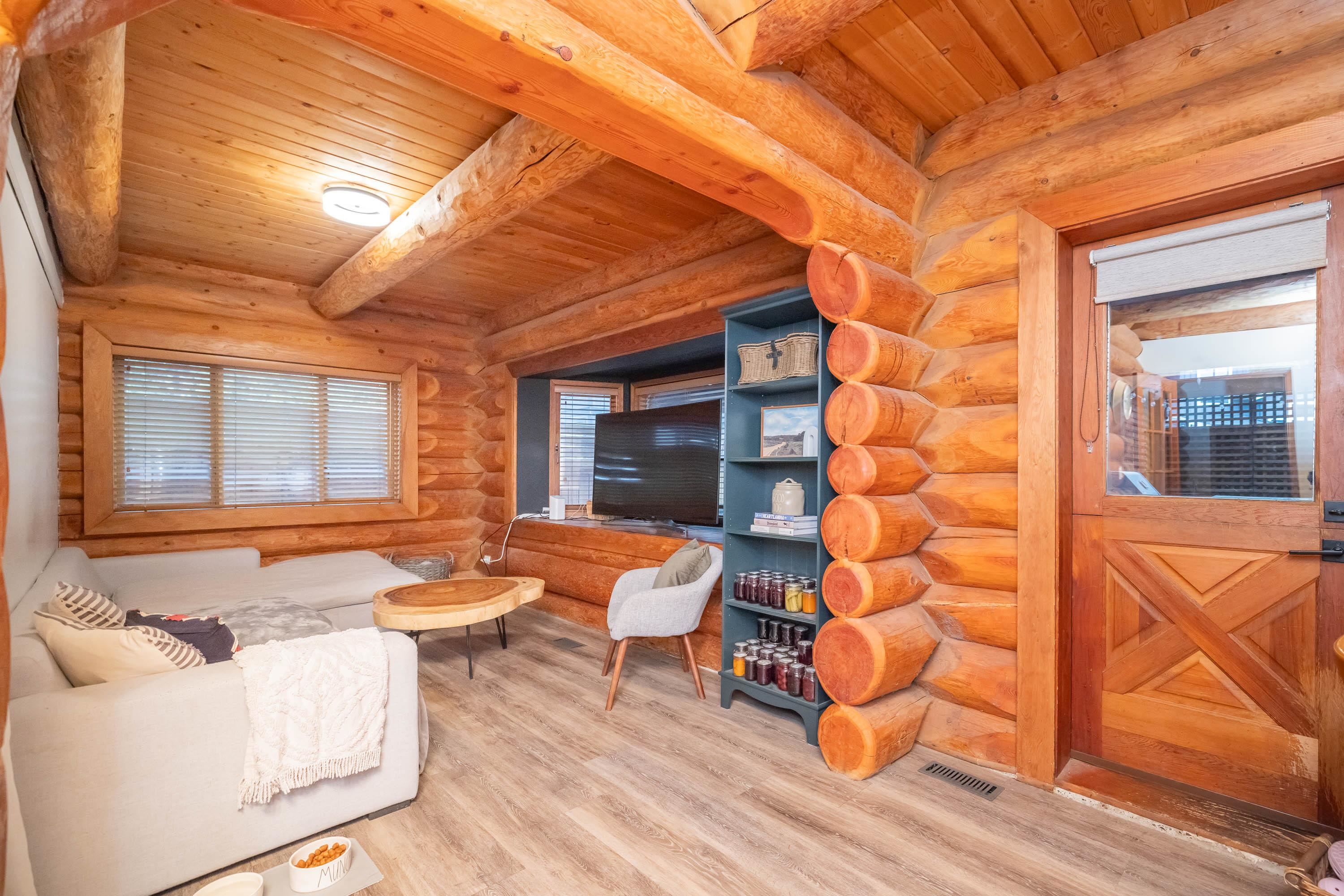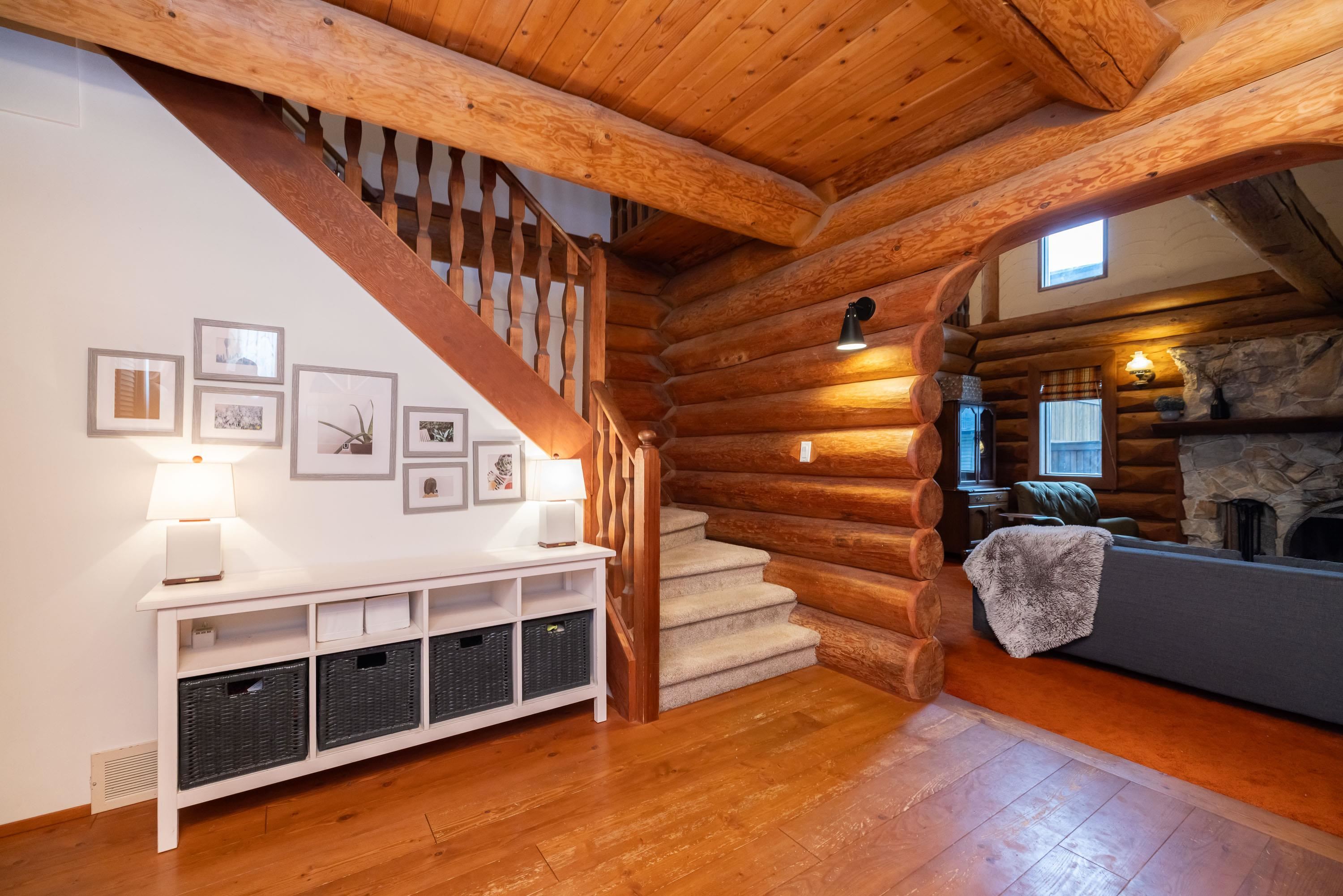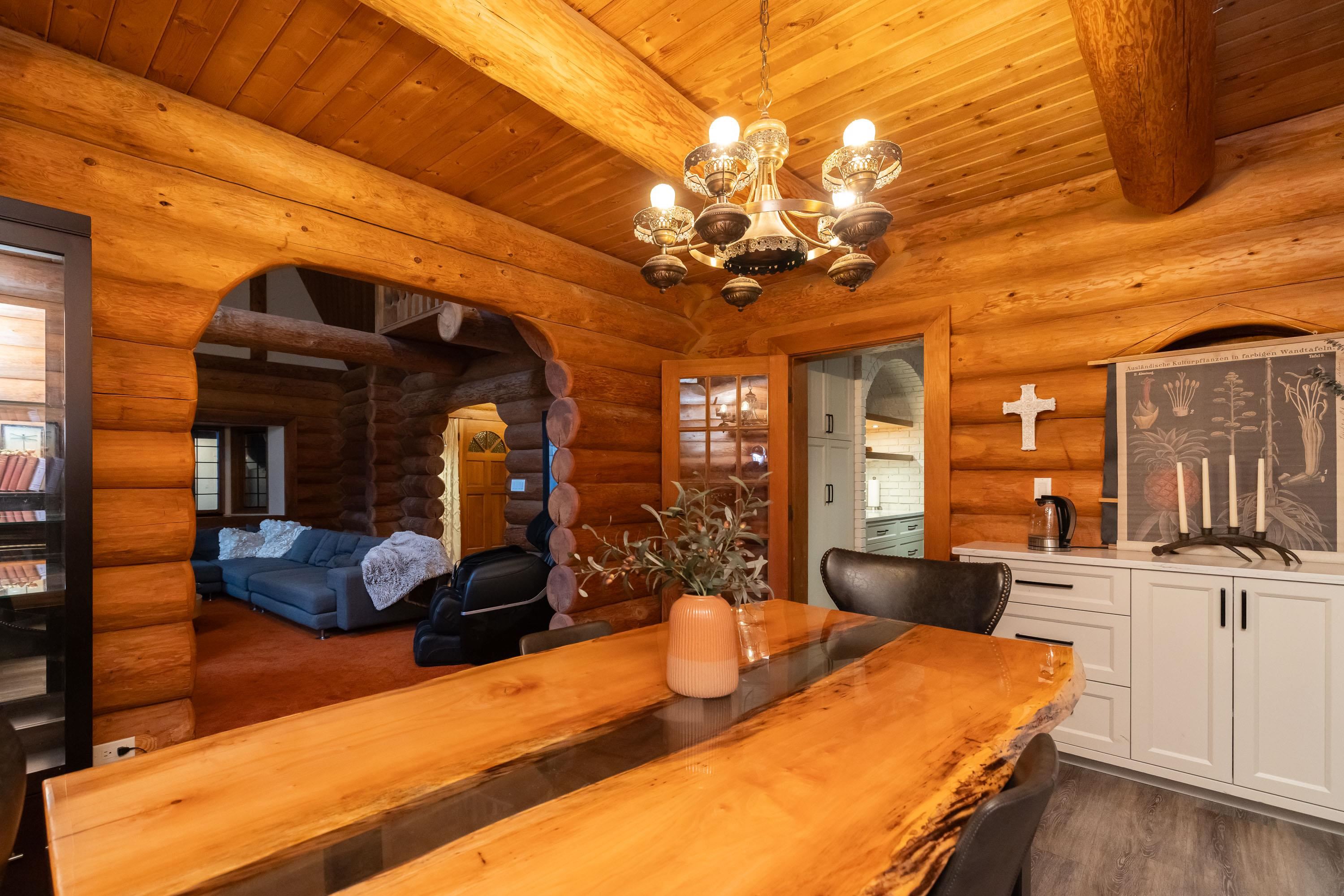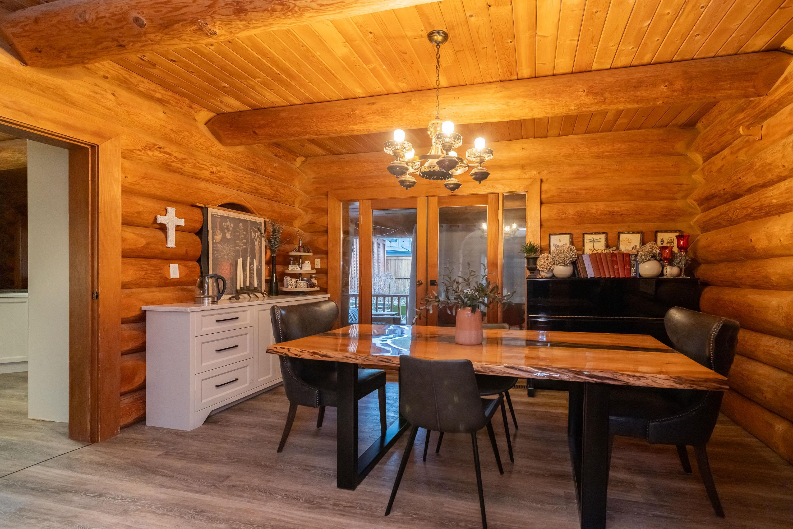 A rare architectural contrast. Traditional log home warmth meets modern architecture, featuring a 3 storey ICF addition built for comfort, quiet, & longevity. The original home offers a main flr bed, kitchen, dining, living & family rooms with vaulted ceilings. Upstairs features 3 more beds, including a spacious primary w/ large closet spaces & an impressive ensuite with heated flooring. Private backyard with garden beds & a covered hot tub area. The modern addition provides flexible space ideal for Airbnb ...
