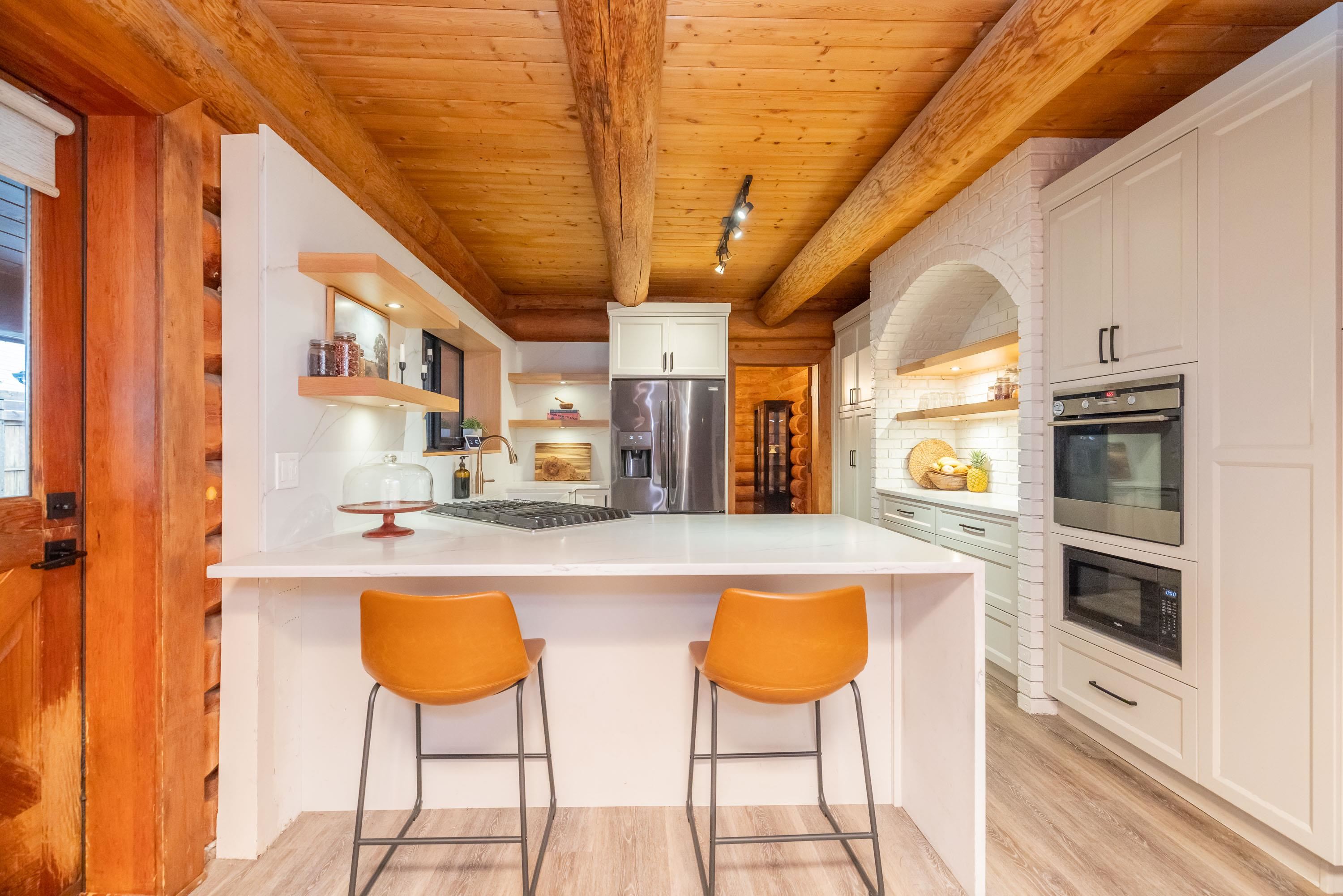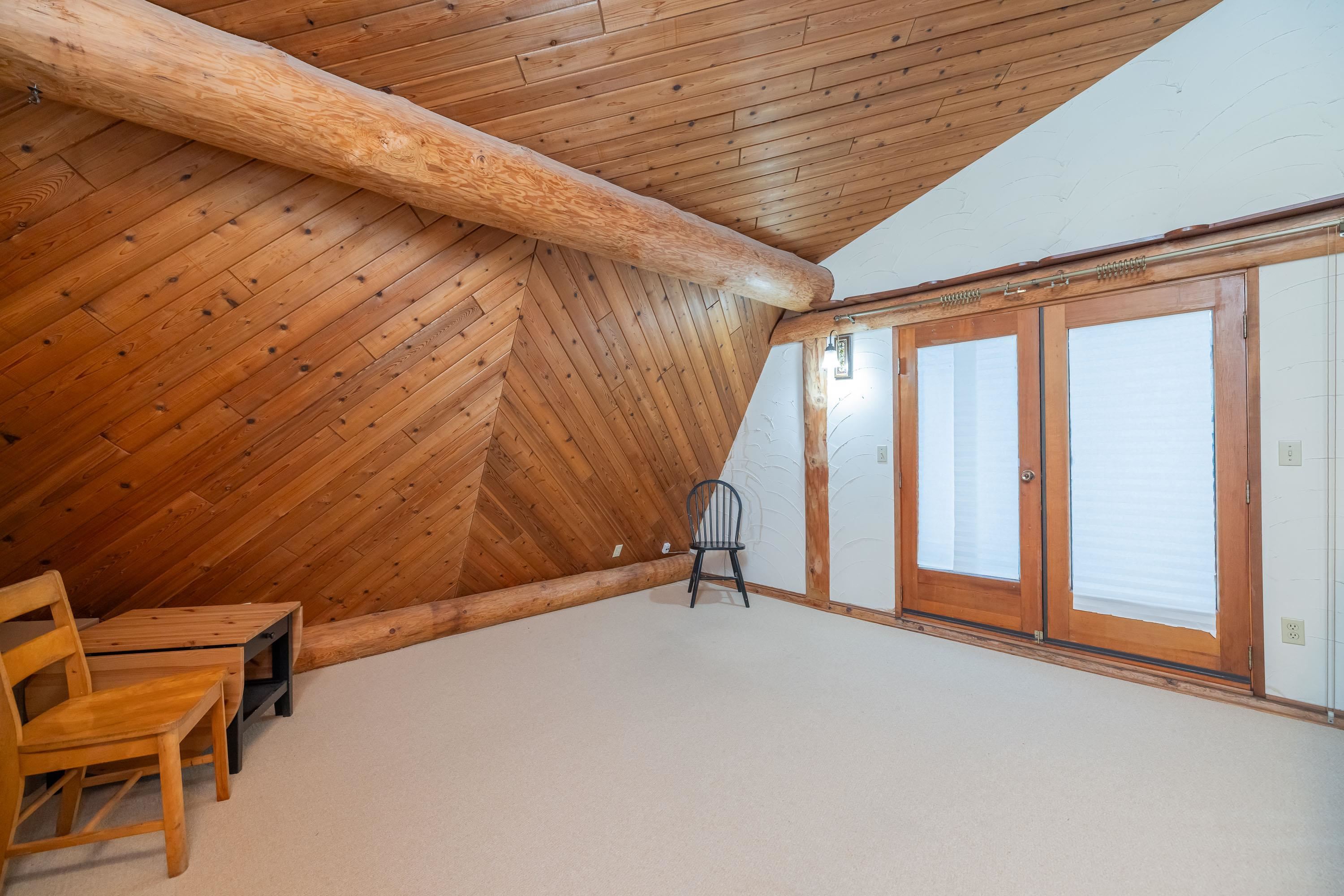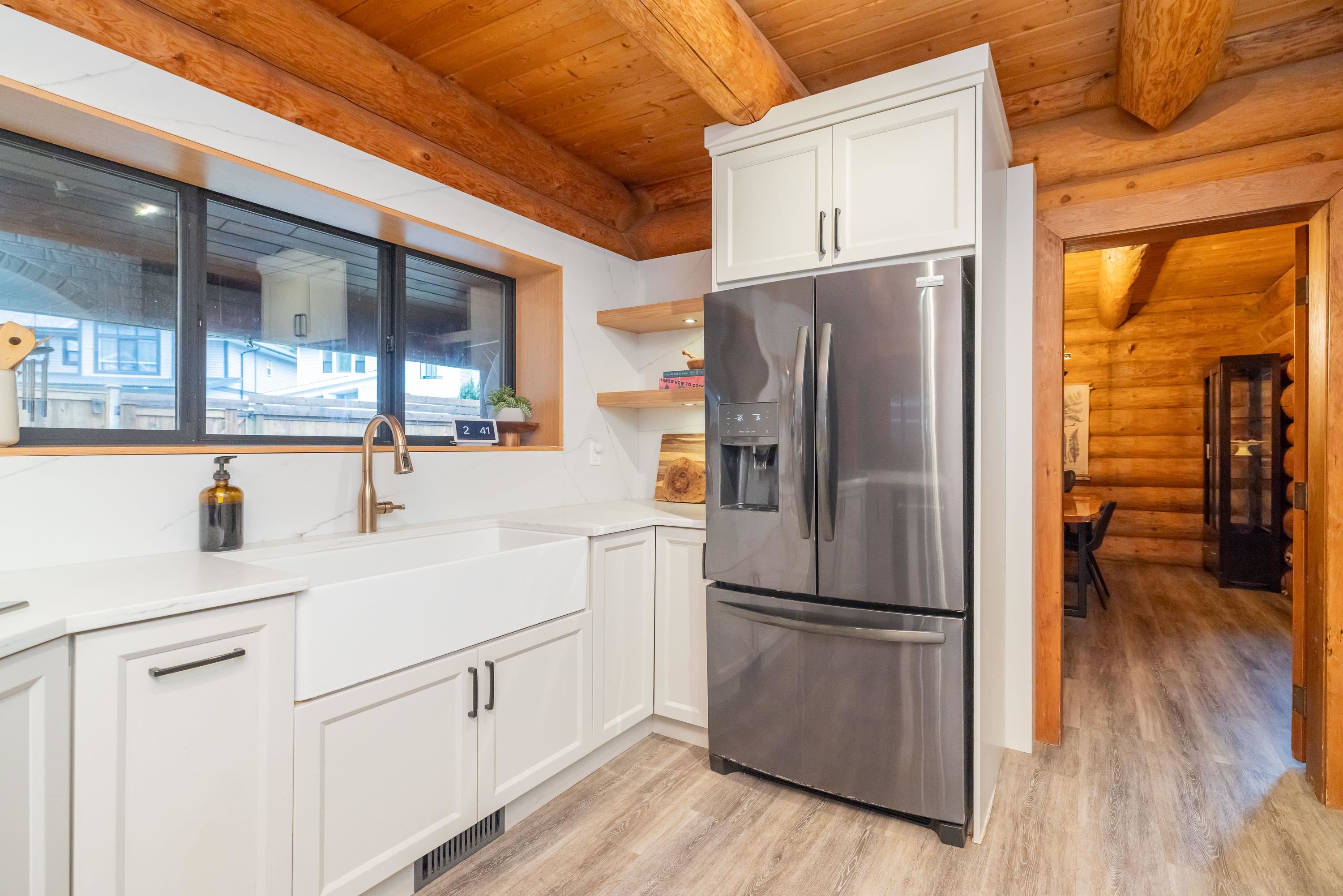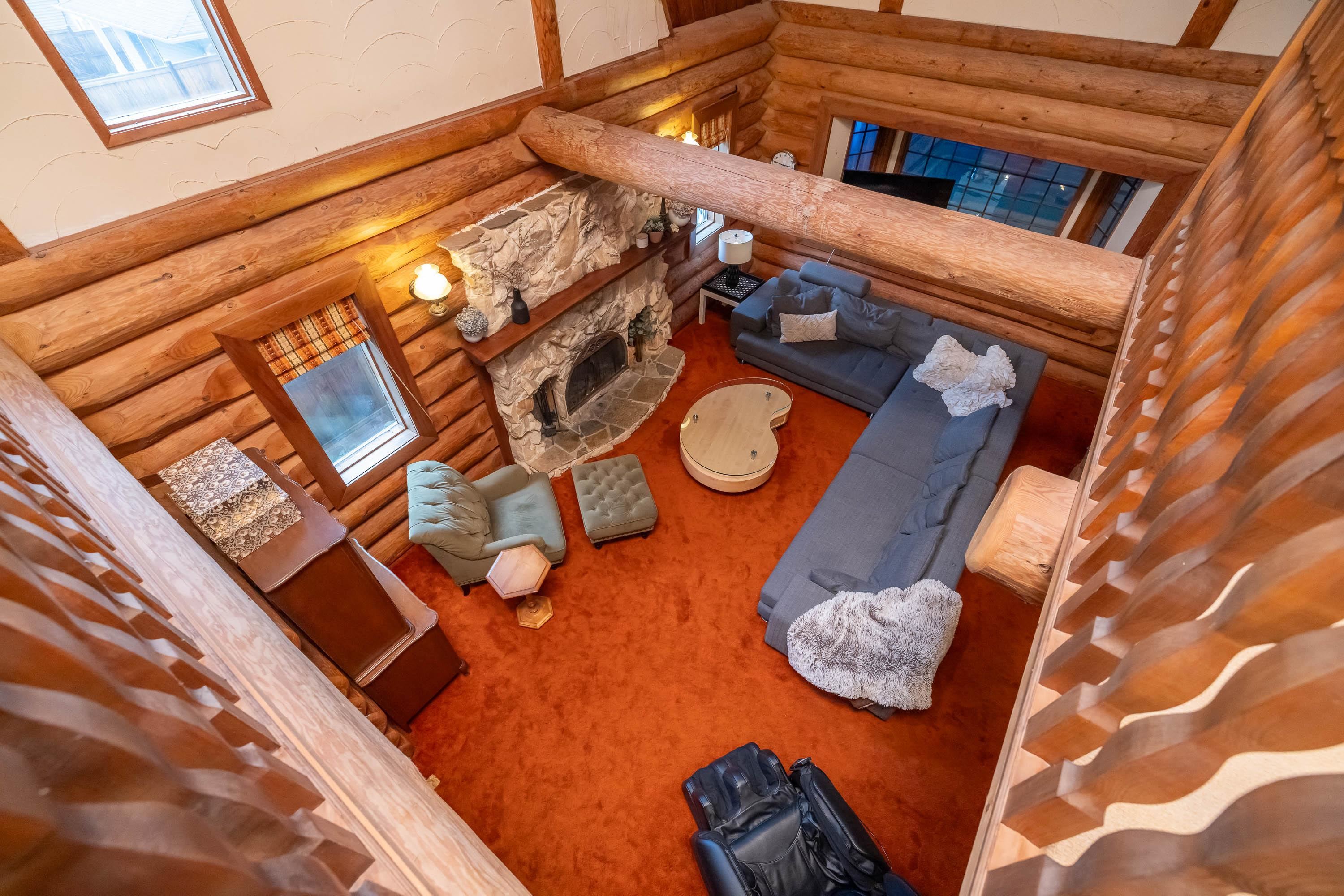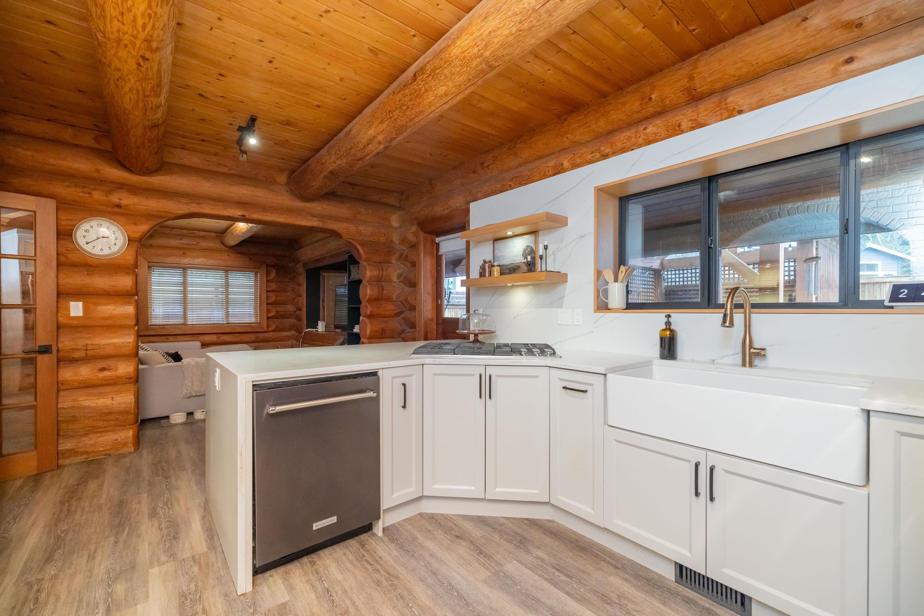 A rare architectural contrast. Traditional log home warmth meets modern architecture, featuring a 3 storey ICF addition built for comfort, quiet, & longevity. The original home offers a main flr bed, kitchen, dining, living & family rooms with vaulted ceilings. Upstairs features 3 more beds, including a spacious primary w/ large closet spaces & an impressive ensuite with heated flooring. Private backyard with garden beds & a covered hot tub area. The modern addition provides flexible space ideal for Airbnb ...