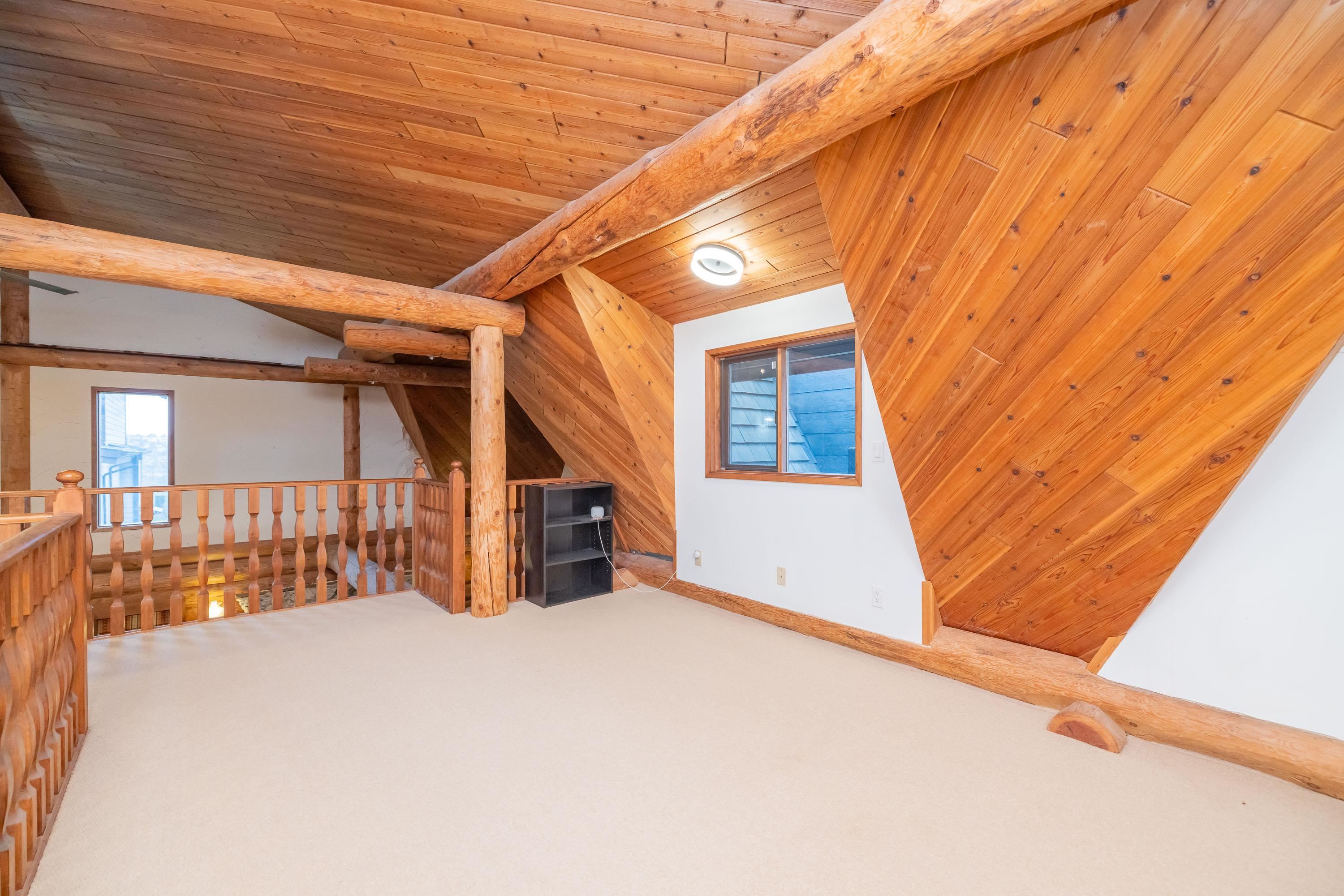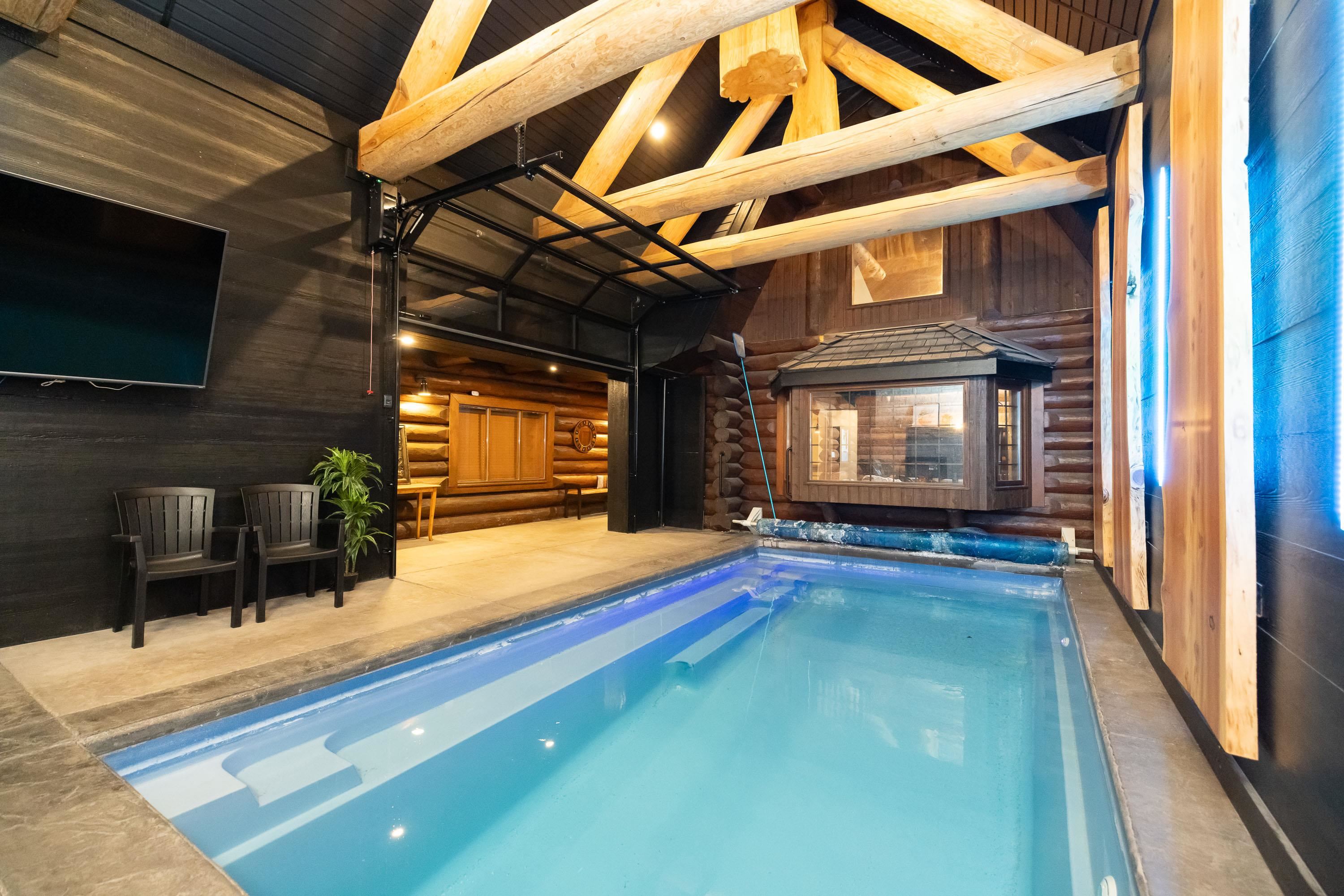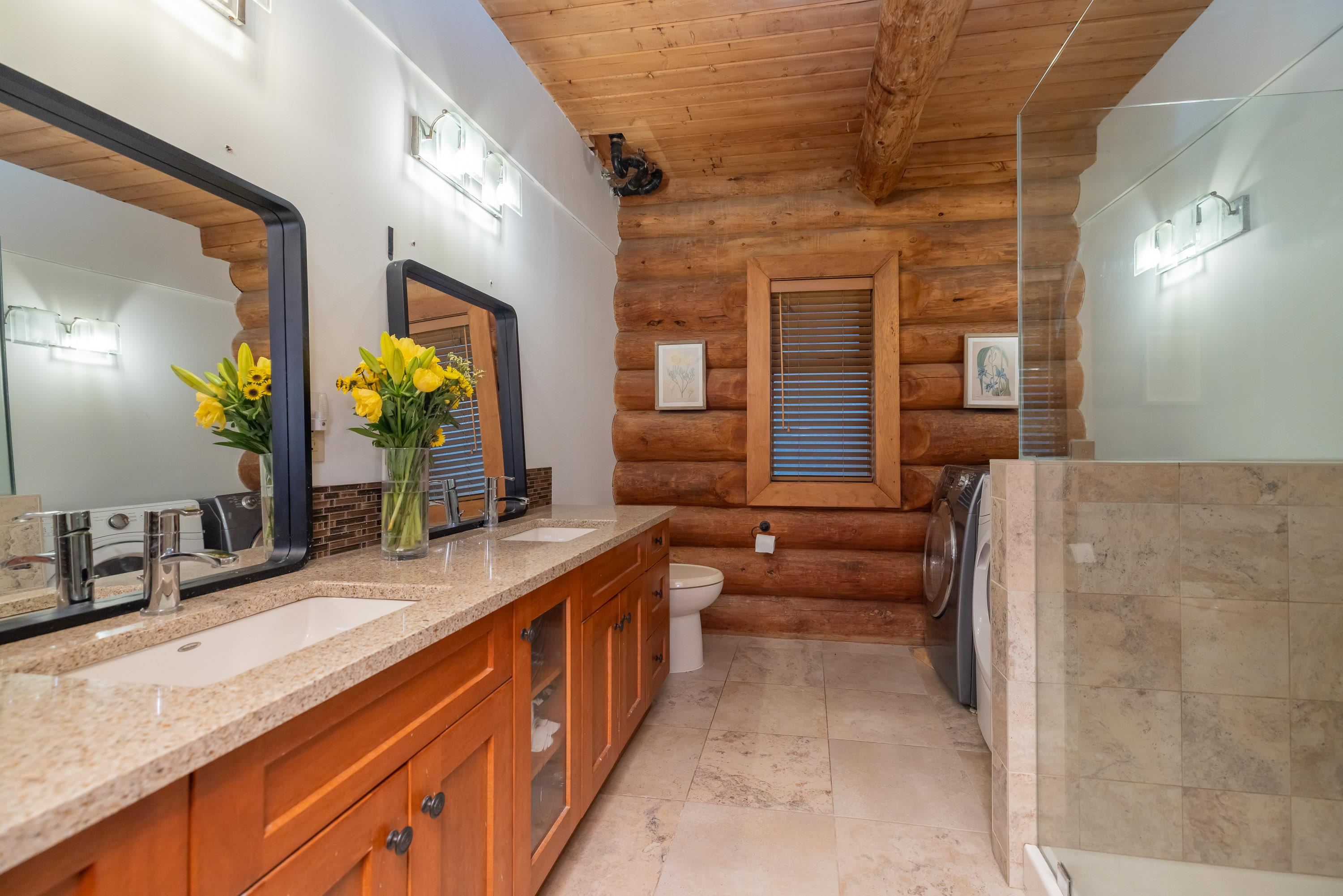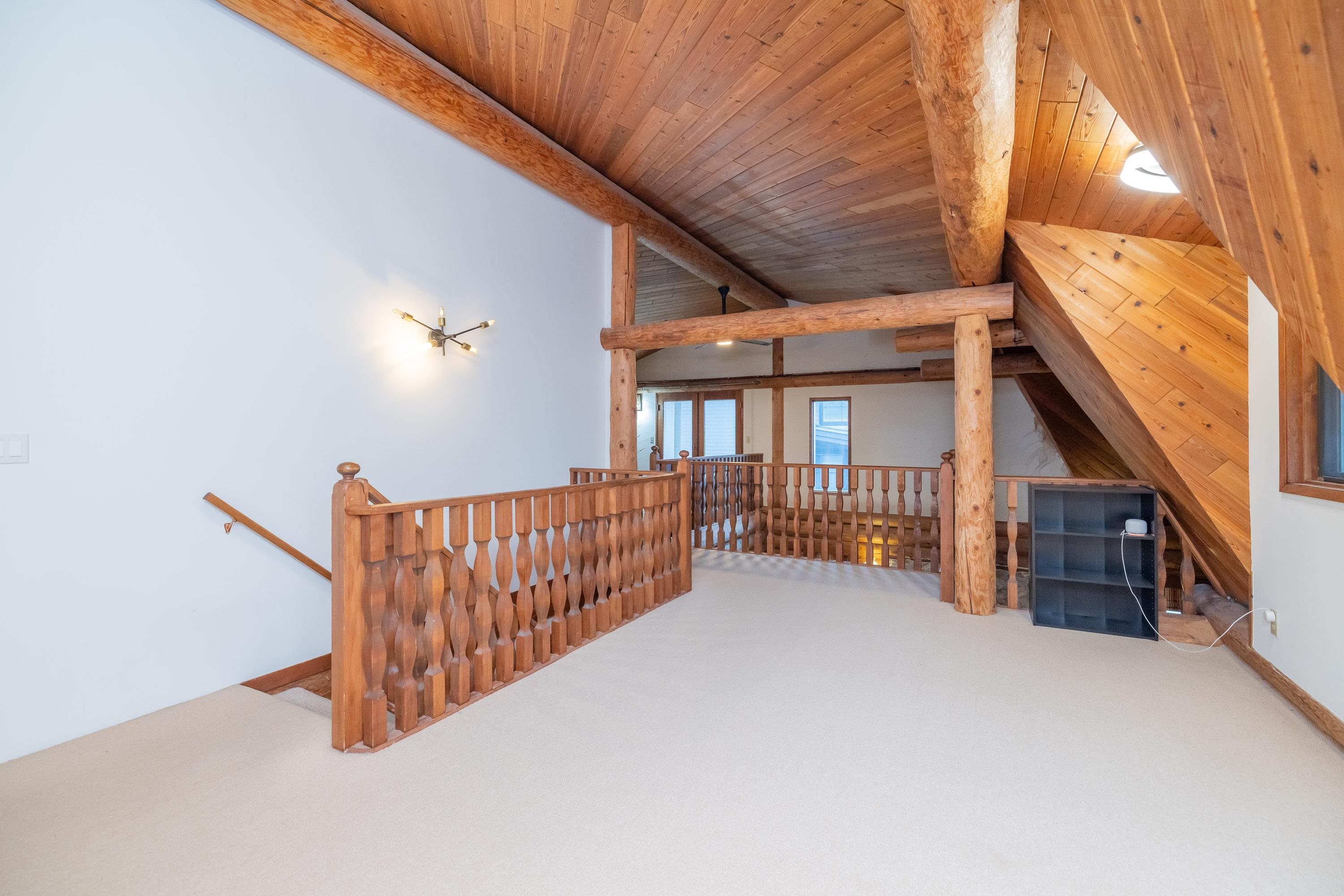 A rare architectural contrast. Traditional log home warmth meets modern architecture, featuring a 3 storey ICF addition built for comfort, quiet, & longevity. The original home offers a main flr bed, kitchen, dining, living & family rooms with vaulted ceilings. Upstairs features 3 more beds, including a spacious primary w/ large closet spaces & an impressive ensuite with heated flooring. Private backyard with garden beds & a covered hot tub area. The modern addition provides flexible space ideal for Airbnb ...