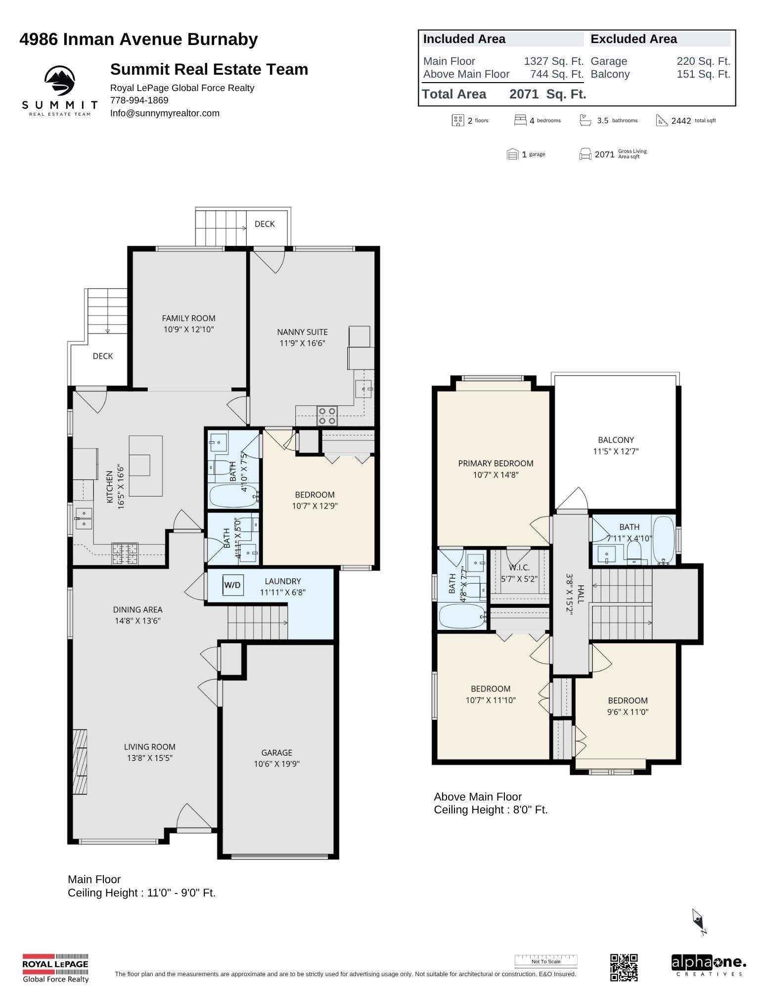 Luxury Living in Burnaby! Discover this custom-built 4 bed, 3.5 bath half duplex. Offering over 2,000 sqft of modern living, this home features a chef-inspired kitchen with quartz counters, stainless steel appliances, stone island, and accent lighting. Experience comfort with radiant in-floor heating, elegant fireplace, and impressive 11’ ceilings in the living room. A private 1-bed nanny suite with separate entry offers income potential or ideal in-law accommodation. Take in mountain views from your privat...
