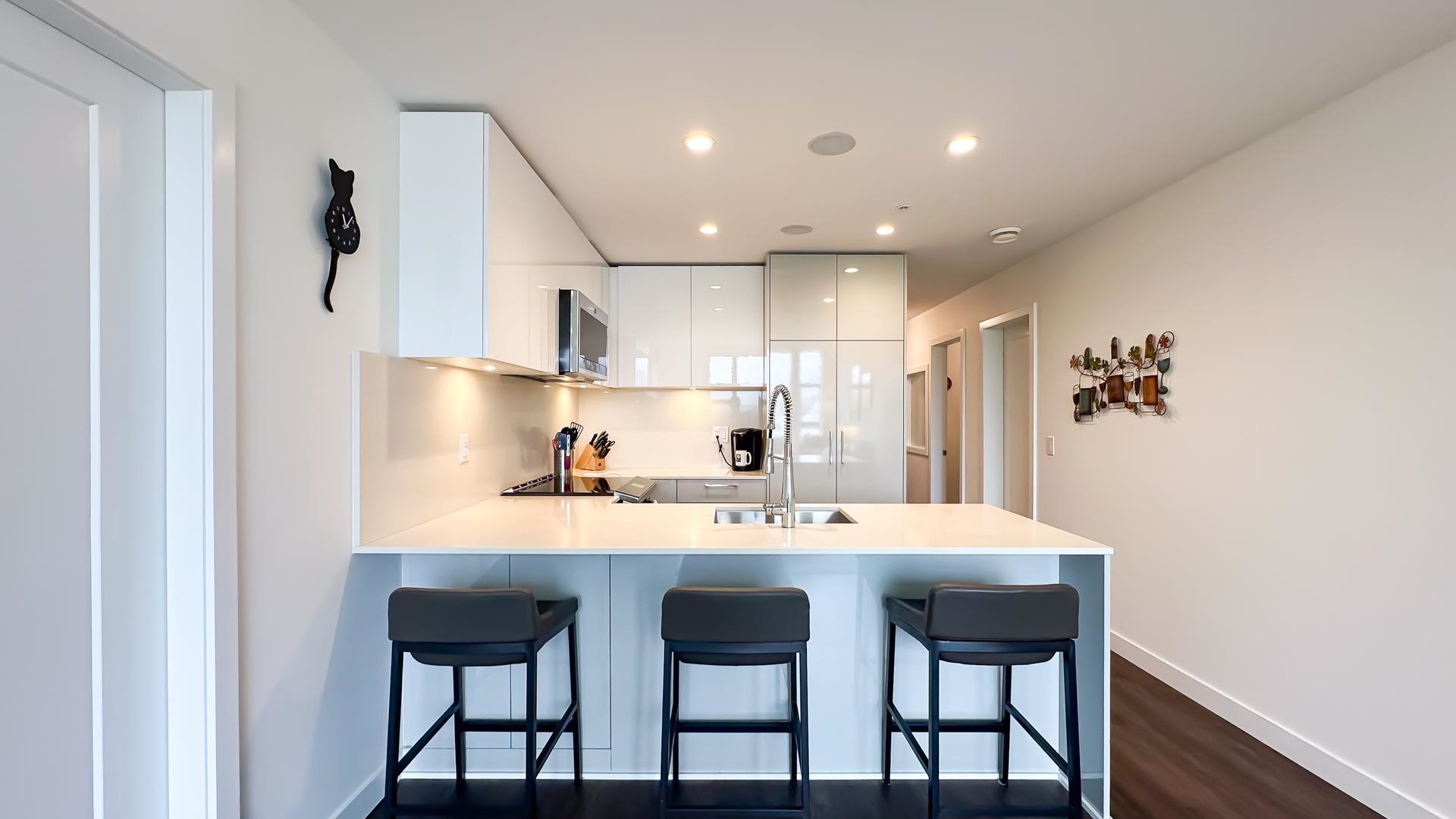 a bright corner 2 bed + den sub-penthouse in Central Port Coquitlam. This upper-floor 1,059 sq ft home features higher ceilings and stunning mountain views from the living room and both bedrooms, with natural light pouring in on clear days. The den includes a custom built-in office (desk and cabinetry fixtures), and a stylish mudroom installation at the entry is also included. In-suite storage adds extra convenience. Every closet, drawer, and cabinet is fully outfitted with custom organizers, including Ca...