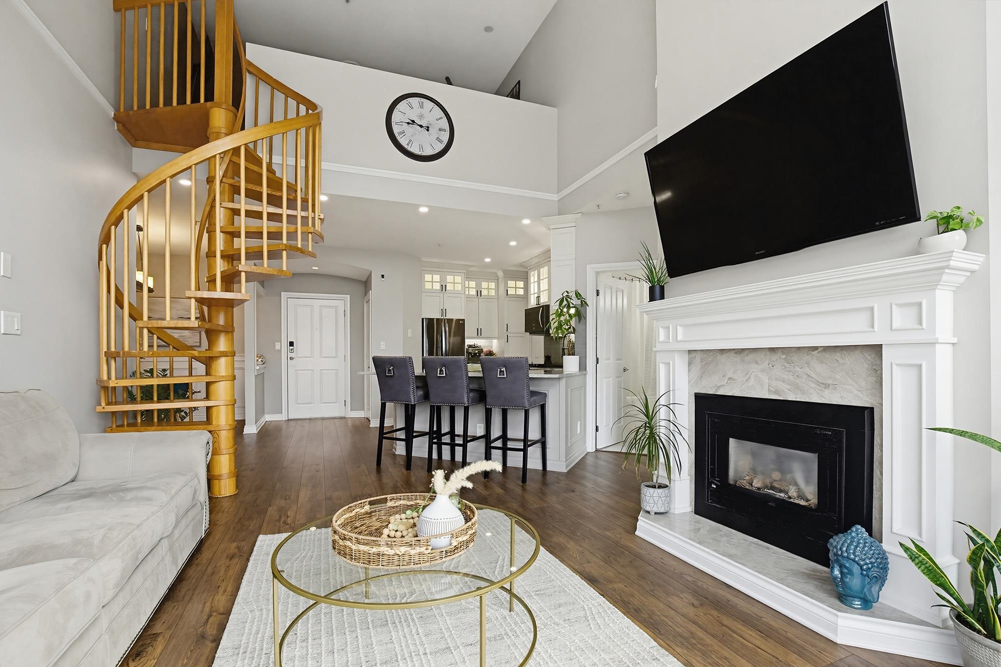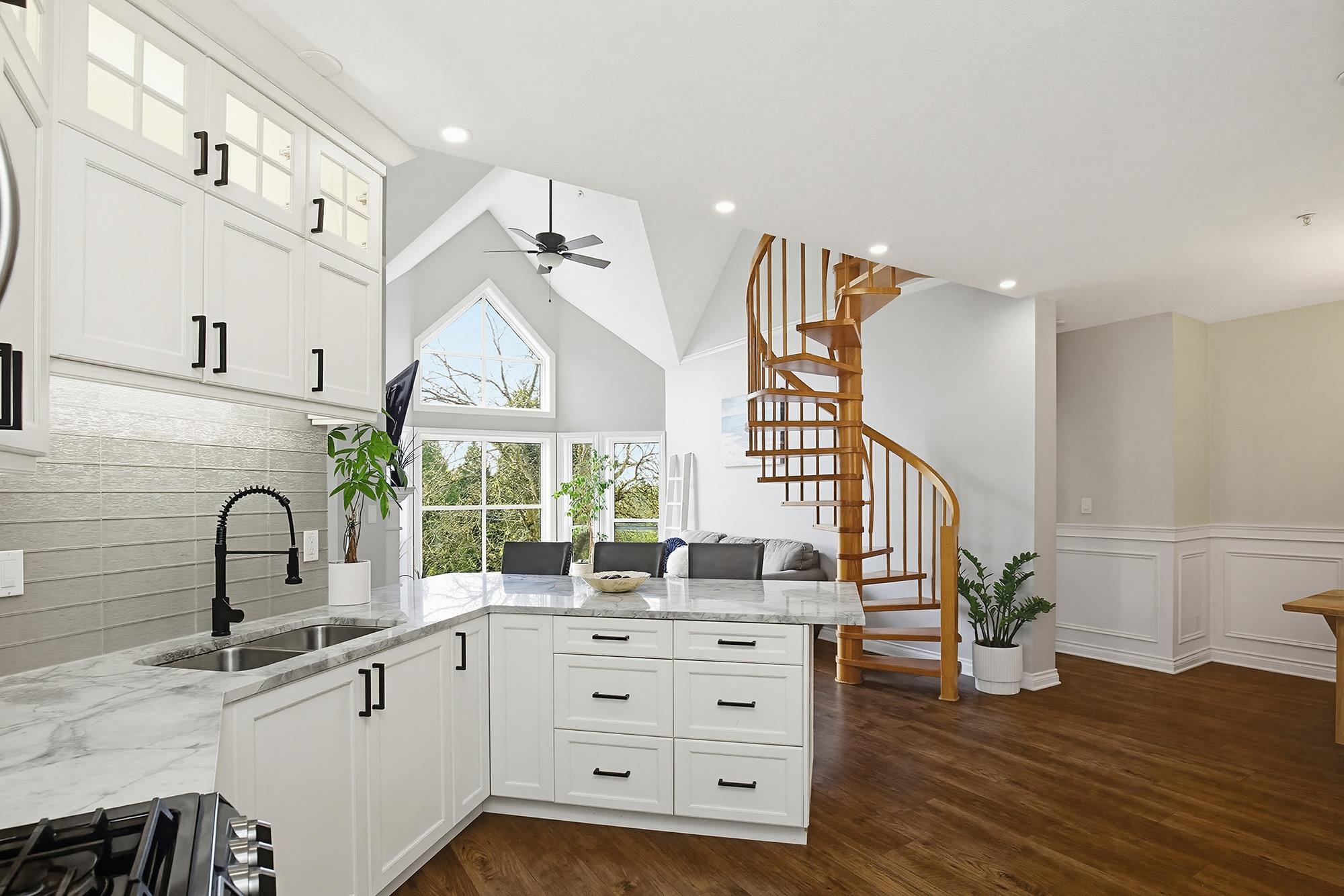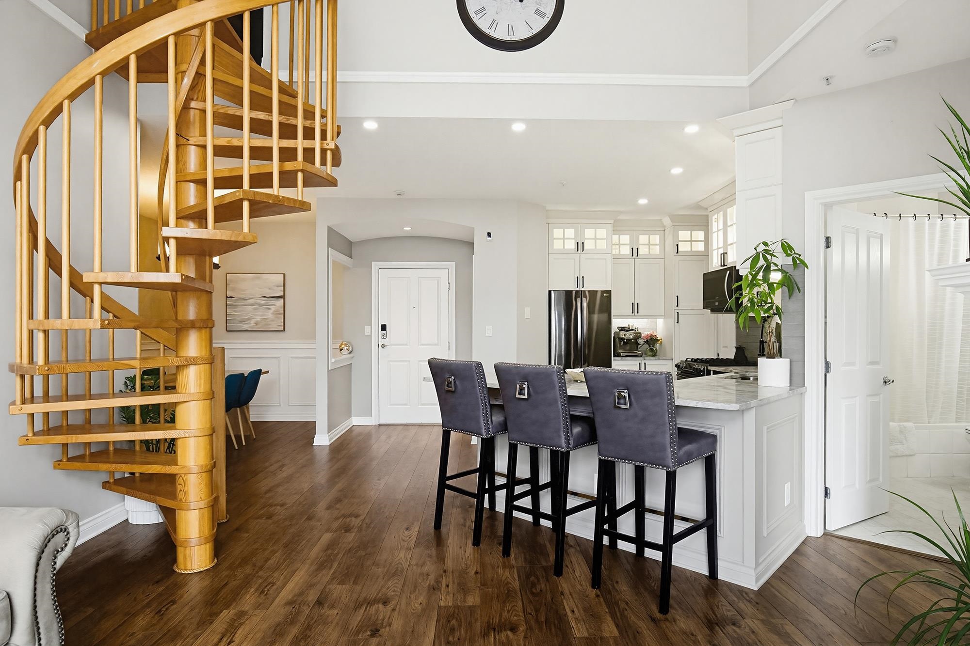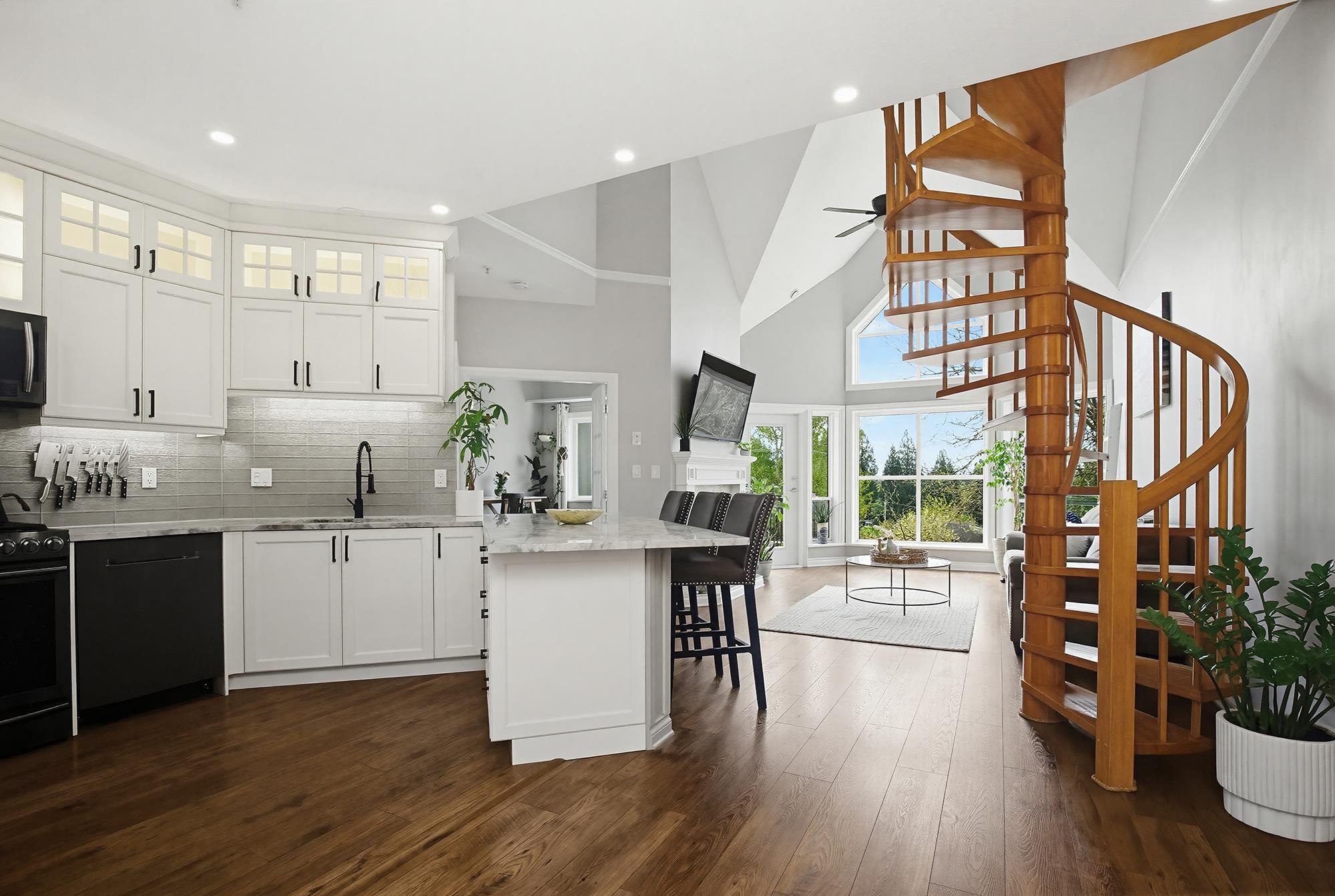 Yale Terrace's crown jewel! 2bd 2bth redefining elevated living w/Dramatic 18ft vaulted ceilings & floor-to-ceiling south-facing windows framing Mount Baker views. Stunning wooden spiral staircase to spacious loft, perfect as home office/gym/or media rm. Chef's kitchen anchored w/ rich marble countertops & floor-to-ceiling cabinets, bold architectural & maximizing the sleek and modern aesthetic. Premium stainless gas range & appliances, making this kitchen as functional as it is stunning. New recessed smart...