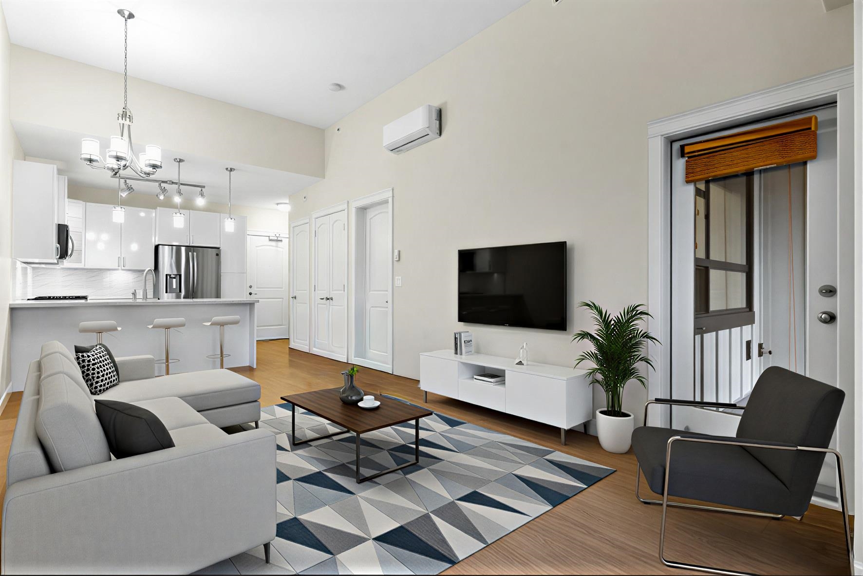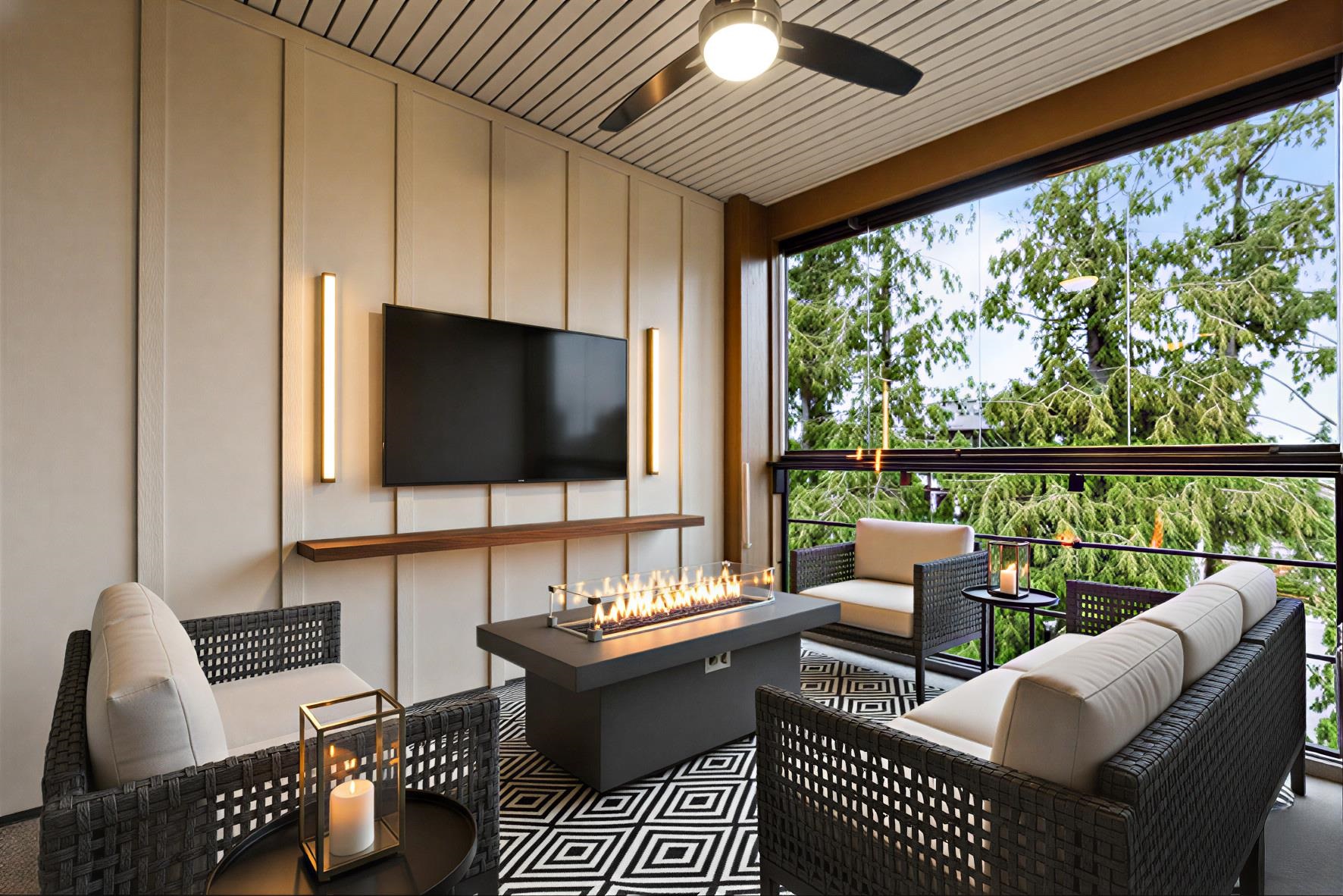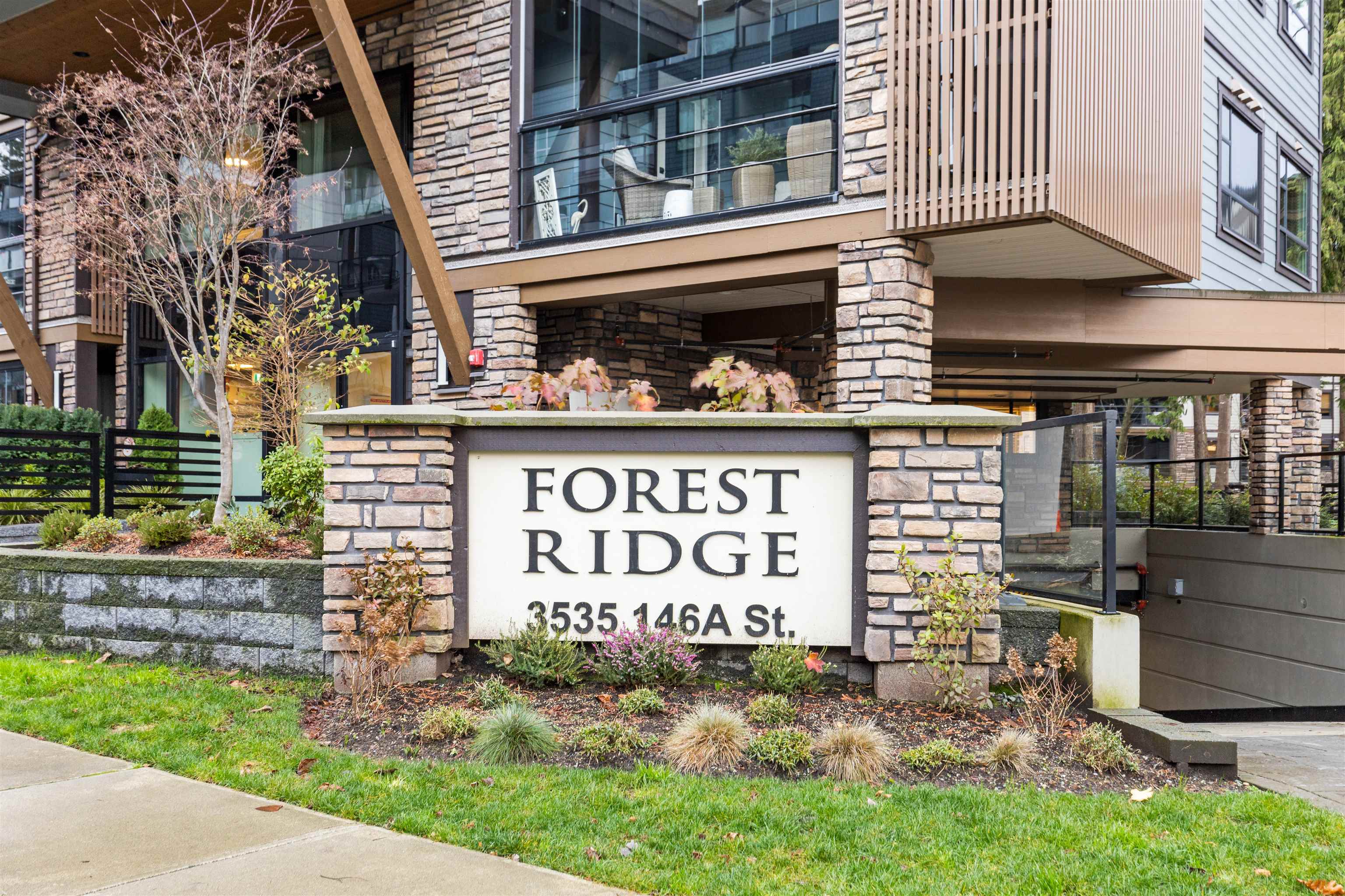 FOREST RIDGE by Quadra Homes. This stylish 1 bed, 1 bath condo includes a 134 sq. ft. solarium with retractable glass and BBQ gas hookup for year-round use. Features a gourmet kitchen with 5-burner gas range, double oven, quartz countertops, and white shaker cabinets, plus 12 ft high ceilings throughout. Extras include A/C, energy-efficient heat pump, heated bathroom floors, frameless glass shower, 2 underground parking stalls, and a private roll-up storage garage. Minutes to Crescent Beach, Hwy 99, King Ge...