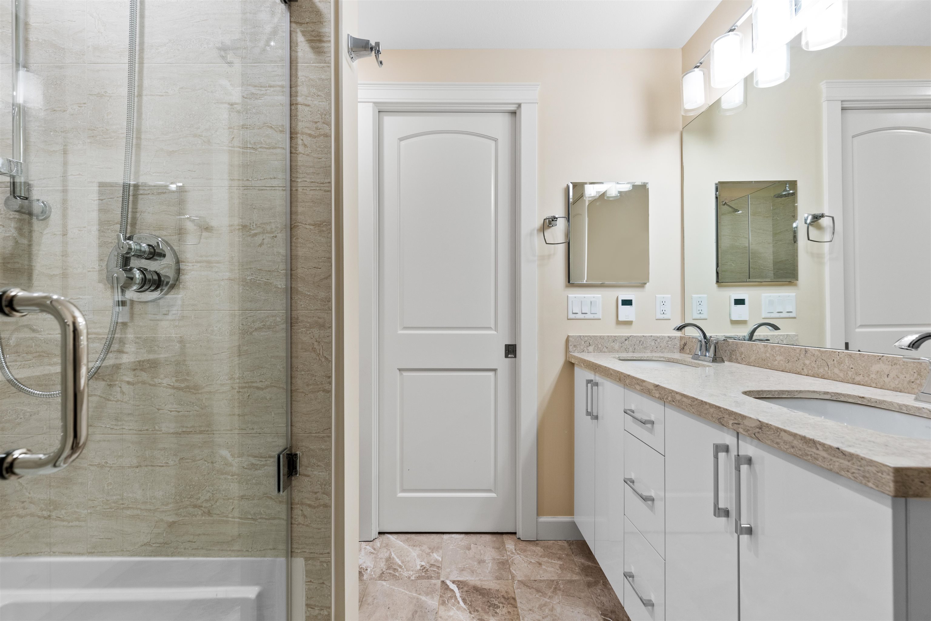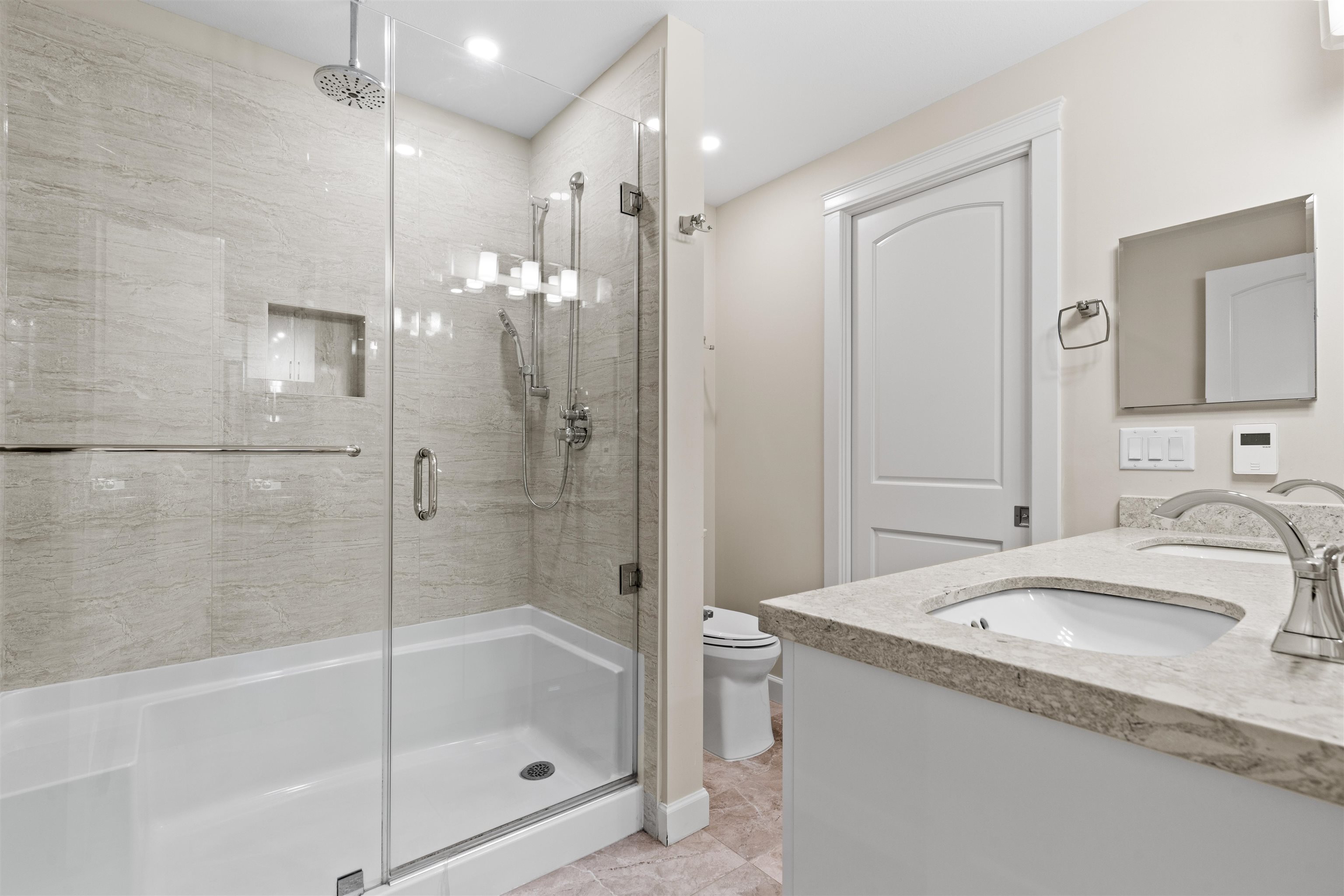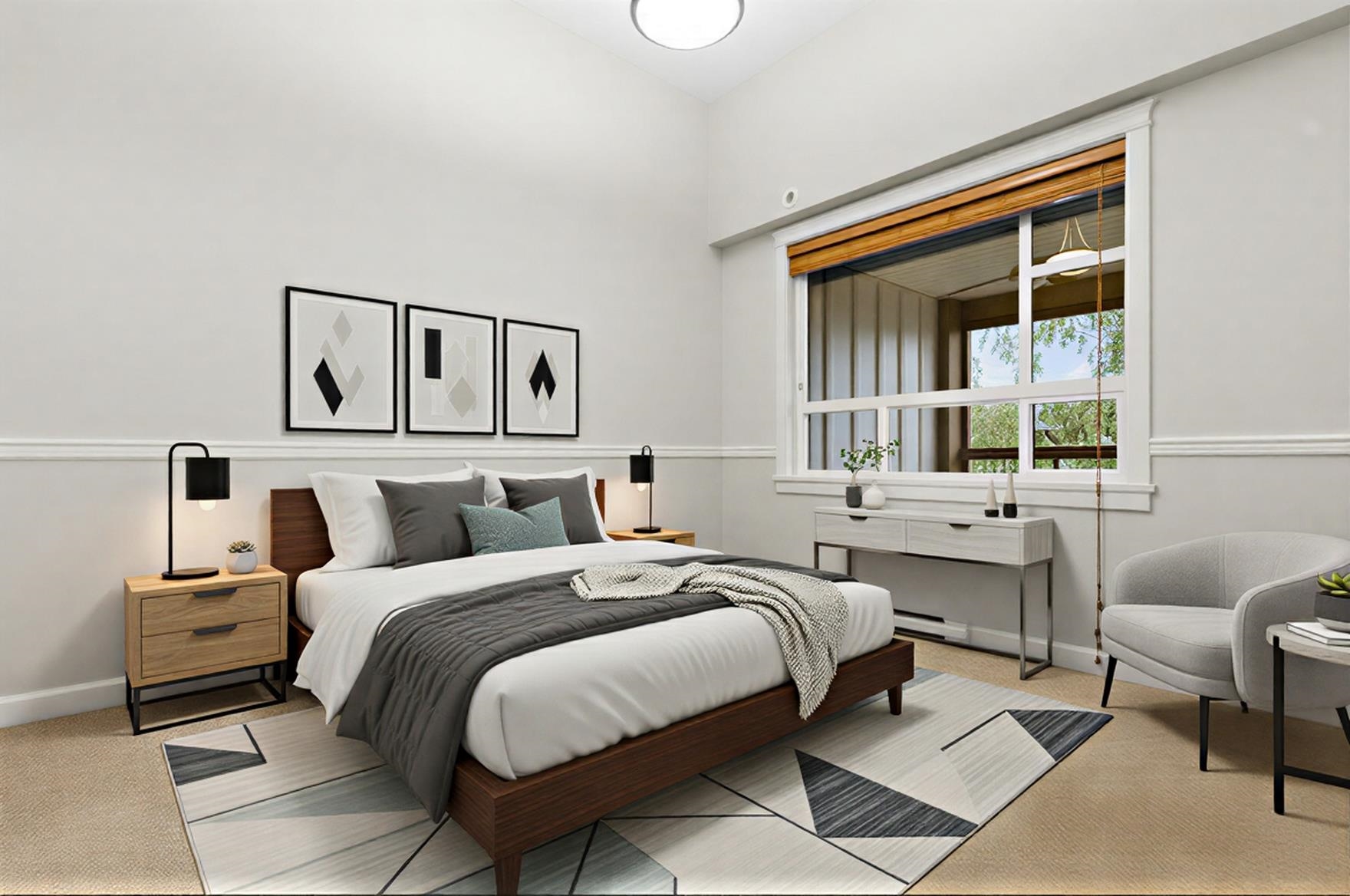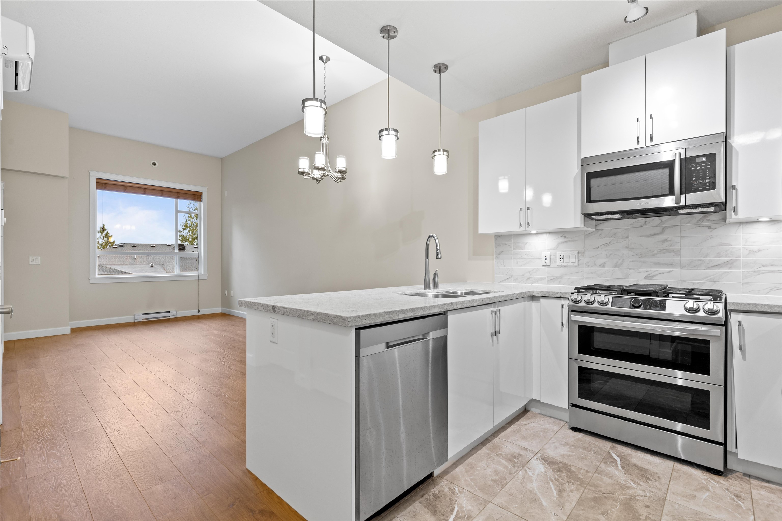 FOREST RIDGE by Quadra Homes. This stylish 1 bed, 1 bath condo includes a 134 sq. ft. solarium with retractable glass and BBQ gas hookup for year-round use. Features a gourmet kitchen with 5-burner gas range, double oven, quartz countertops, and white shaker cabinets, plus 12 ft high ceilings throughout. Extras include A/C, energy-efficient heat pump, heated bathroom floors, frameless glass shower, 2 underground parking stalls, and a private roll-up storage garage. Minutes to Crescent Beach, Hwy 99, King Ge...