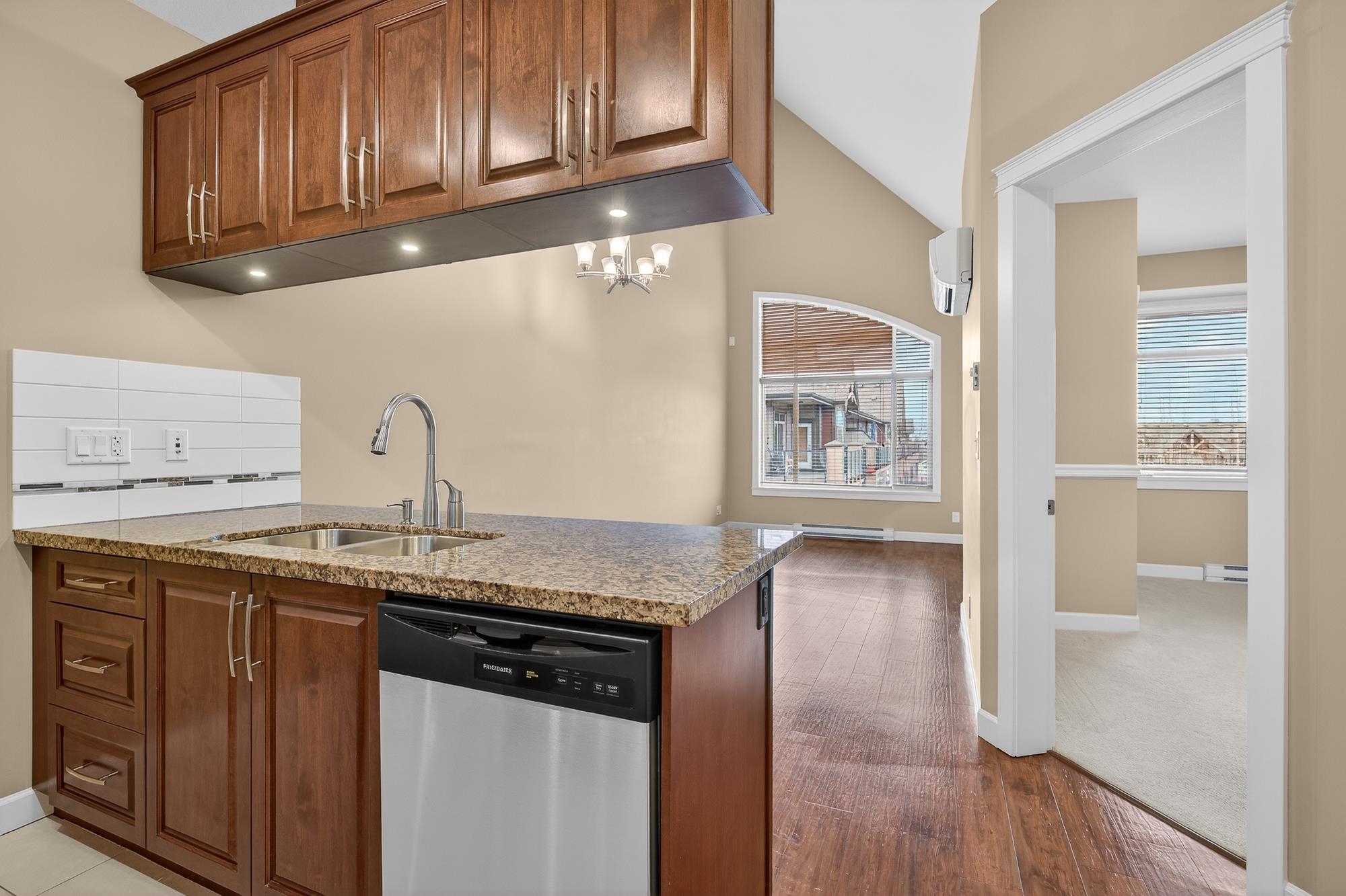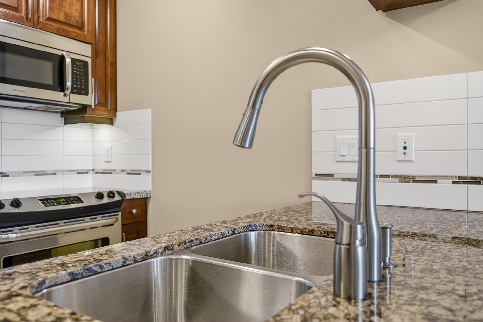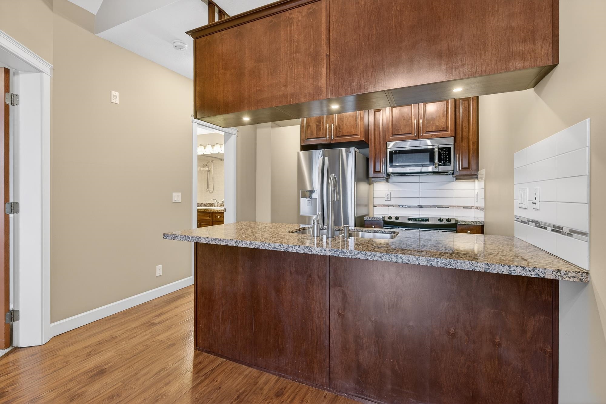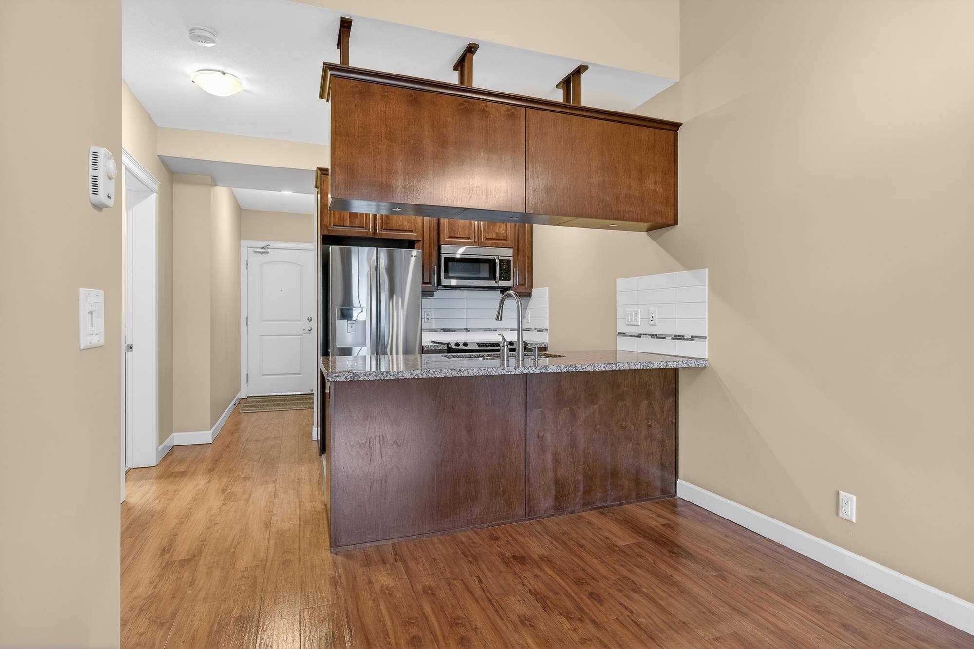 TOP FLOOR PENTHOUSE WITH SOARING CEILINGS AND A QUIET, WESTWARD VIEW! This one's perfect. Immaculately-maintained, air-conditioned, with 2 parking spaces and an oversized storage locker right at your parking stall. With views of the park from your west-facing living area and deck, you get natural light. Stone counter tops, hardwood cabinets, high-durability vinyl plank flooring and a lot of pluses. Walnut Ridge is known also for being one of the most soundproof buildings in the area, with high-level constru...