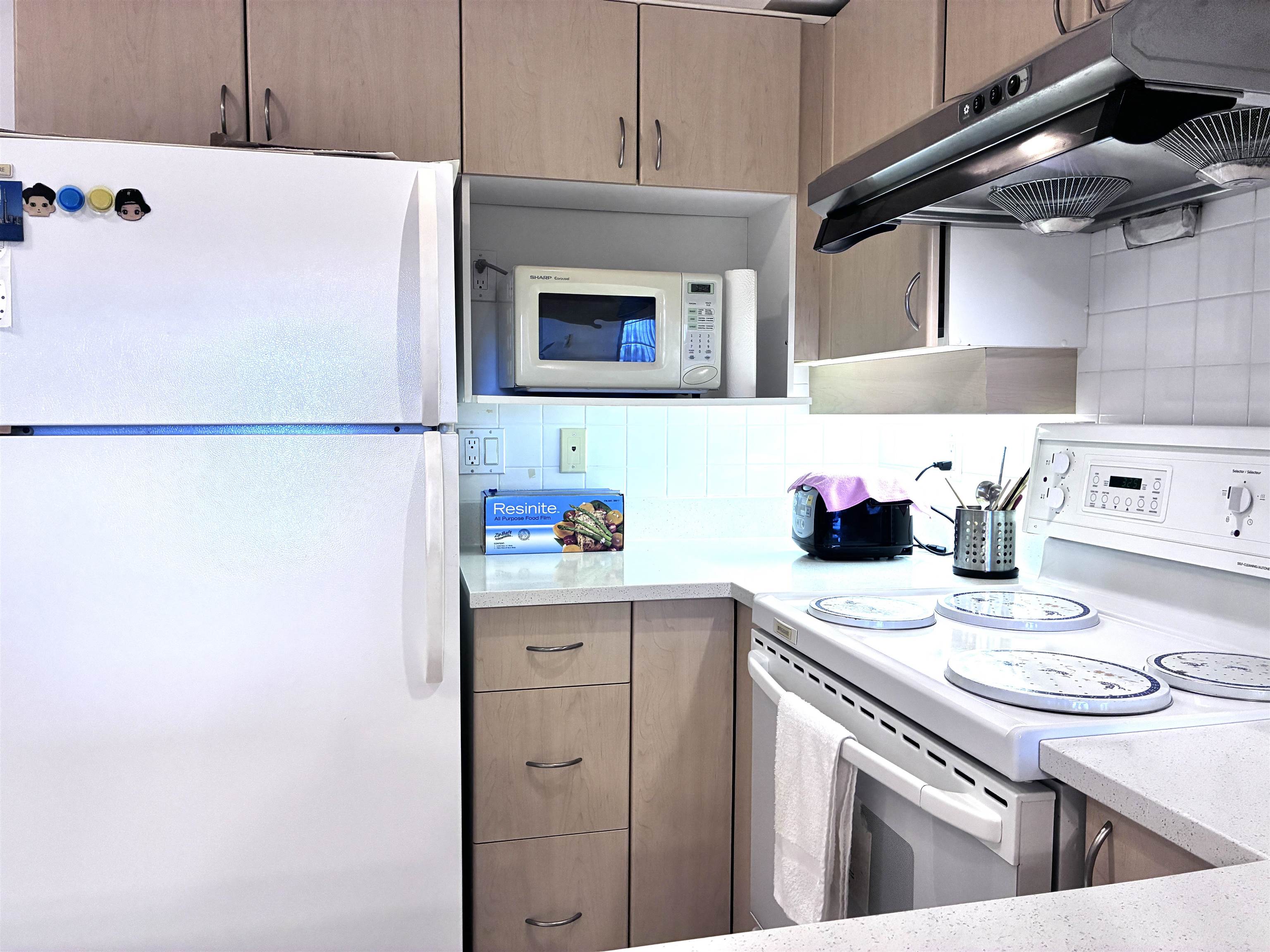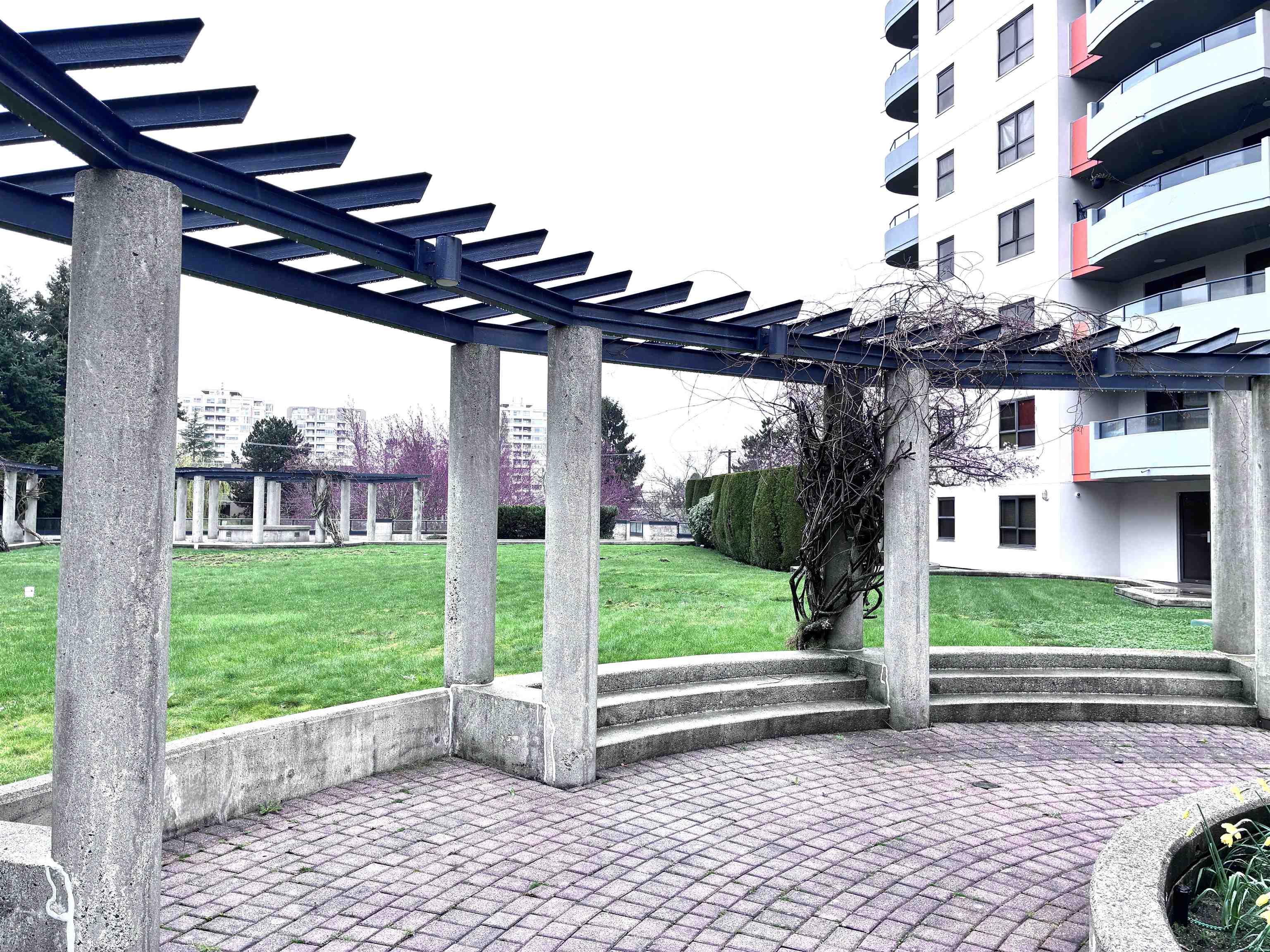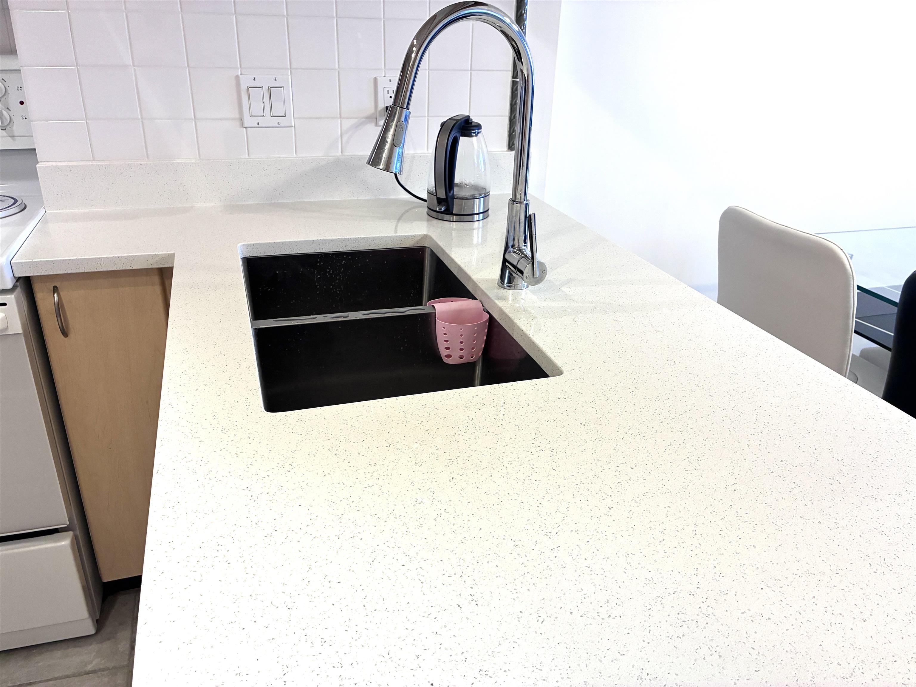 One of the best values at Manhattan Tower, a concrete high-rise in the heart of Richmond with stunning mountain and city views. This well-maintained 1 bed, 1 bath home features a bright open layout with spacious living and dining areas. Generous bedroom fits various bed sizes and dressers. Tastefully updated kitchen with new quartz countertop, sink, and range hood, plus new laminate flooring and window coverings throughout. Enjoy the oversized balcony for outdoor living. Prime location steps to Richmond Cen...