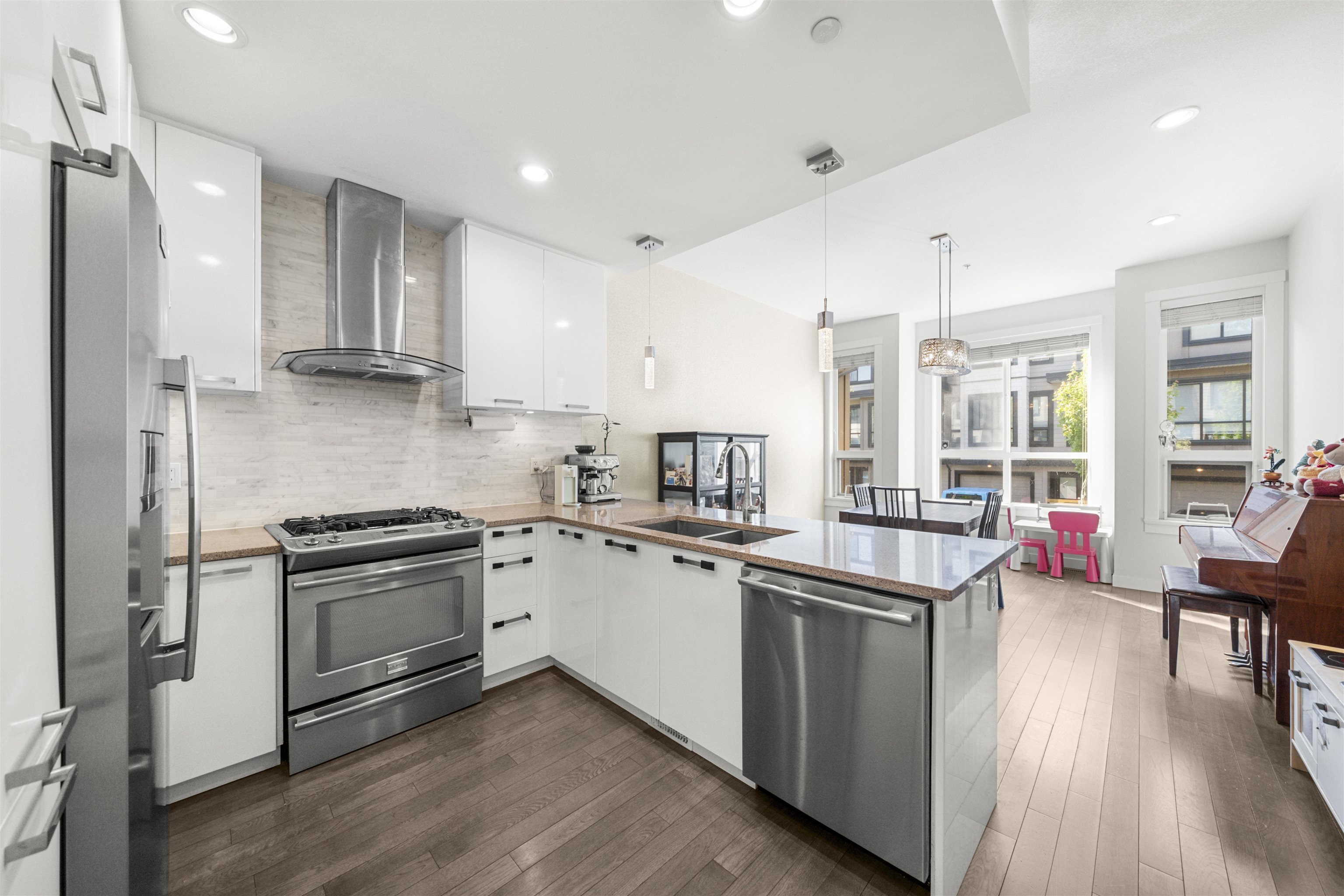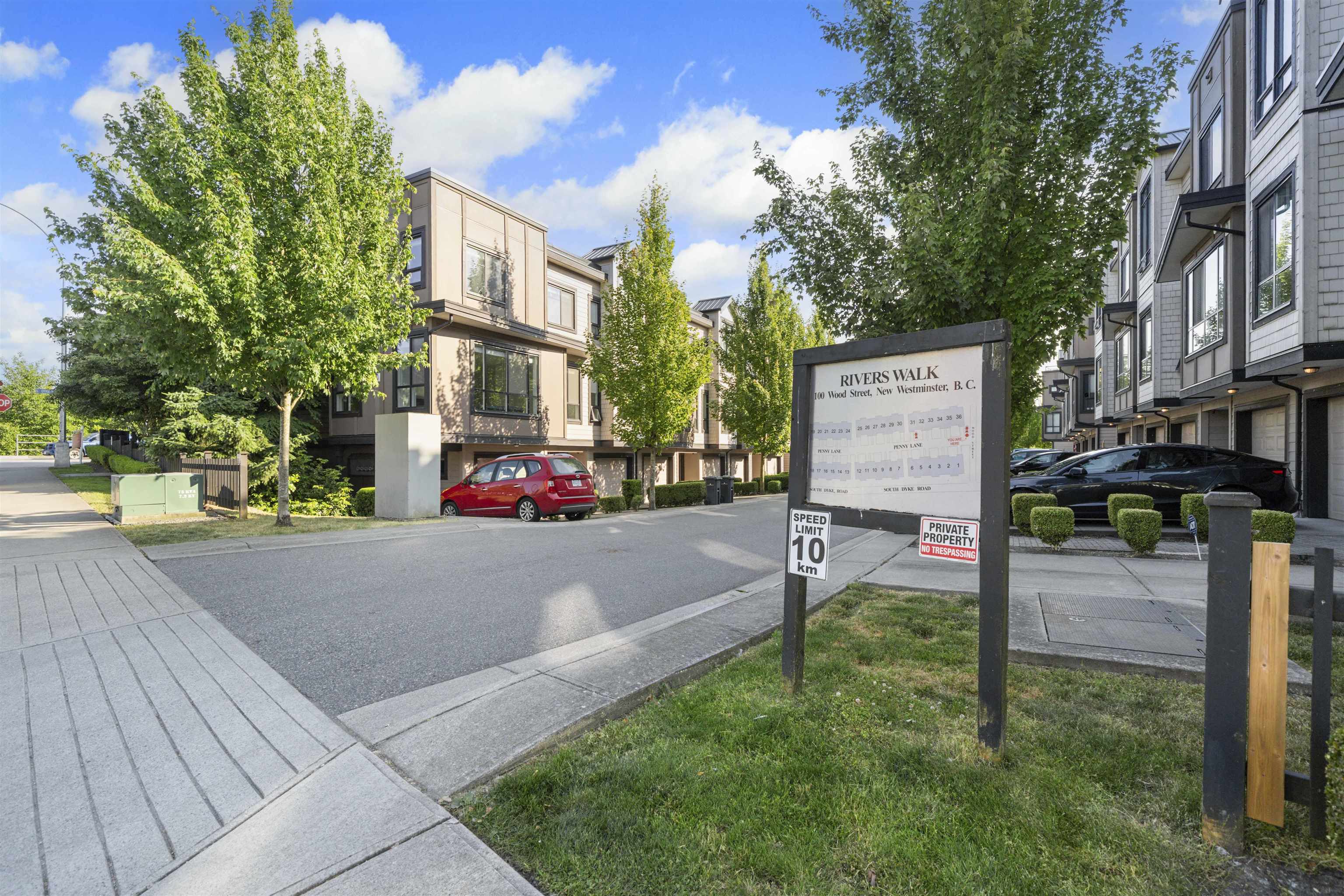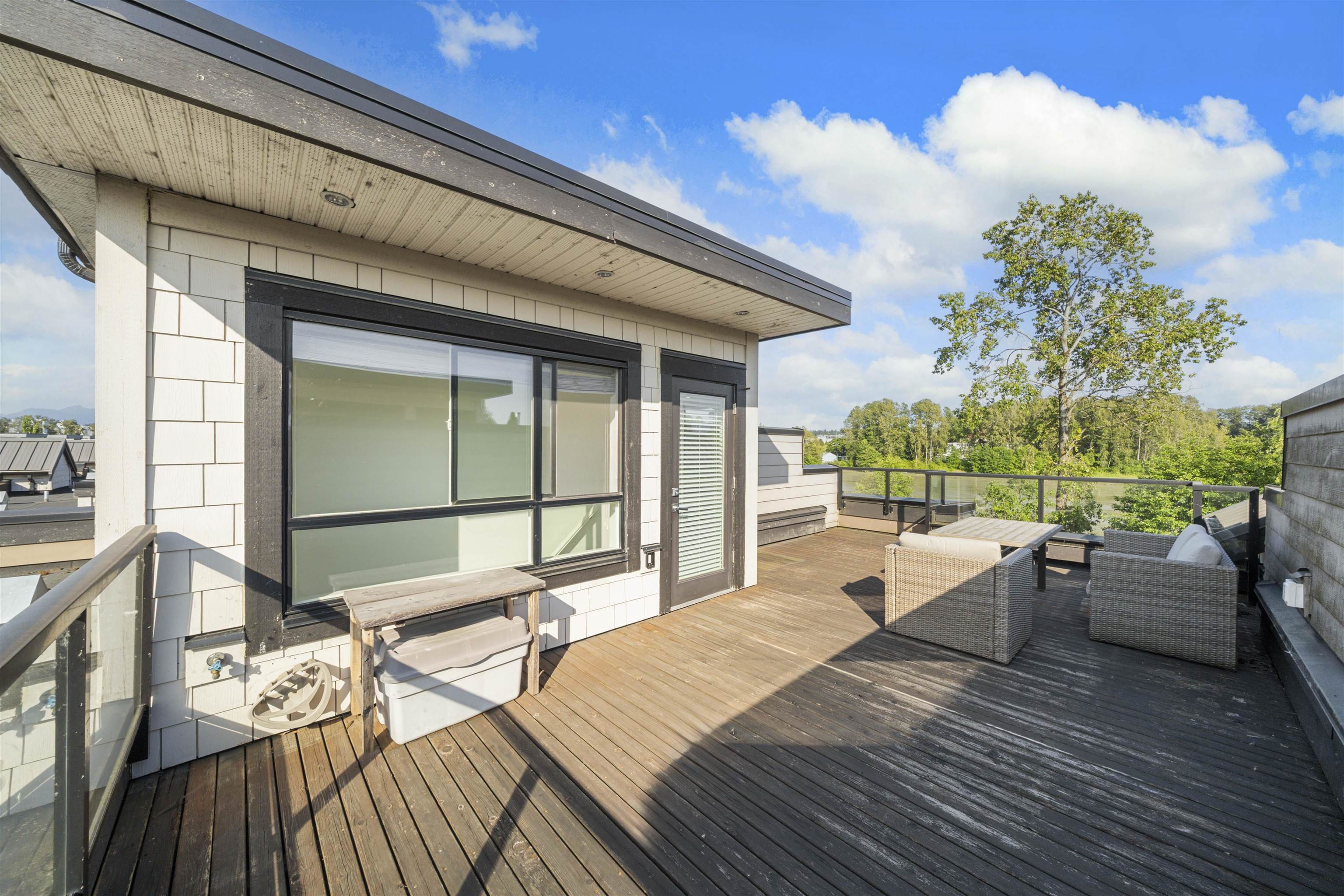 RIVERFRONT RETREAT! This bright and quiet 3-bed, 2.5-bath townhome (1,590 sq ft) in River’s Walk offers ideal indoor-outdoor living with a fenced yard on the riverfront greenway and a 356sq ft rooftop deck featuring a natural gas BBQ hook-up and river view. The main level boasts 9' ceilings, laminate hardwood floors, a gas fireplace, and stainless steel appliances. Upstairs, enjoy a king-sized primary retreat with 5-piece ensuite, two spacious bedrooms, and another full bath. Tandem garage plus driveway fit...