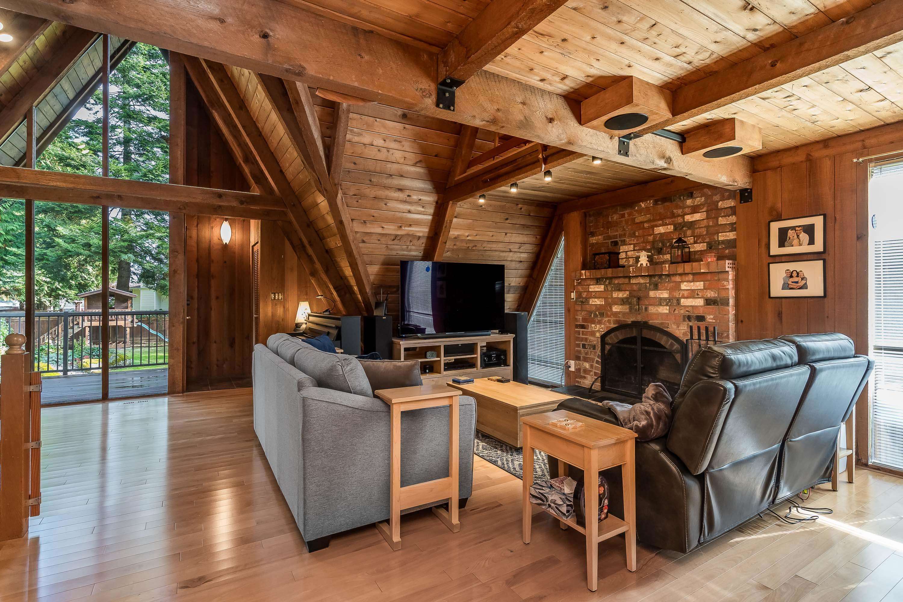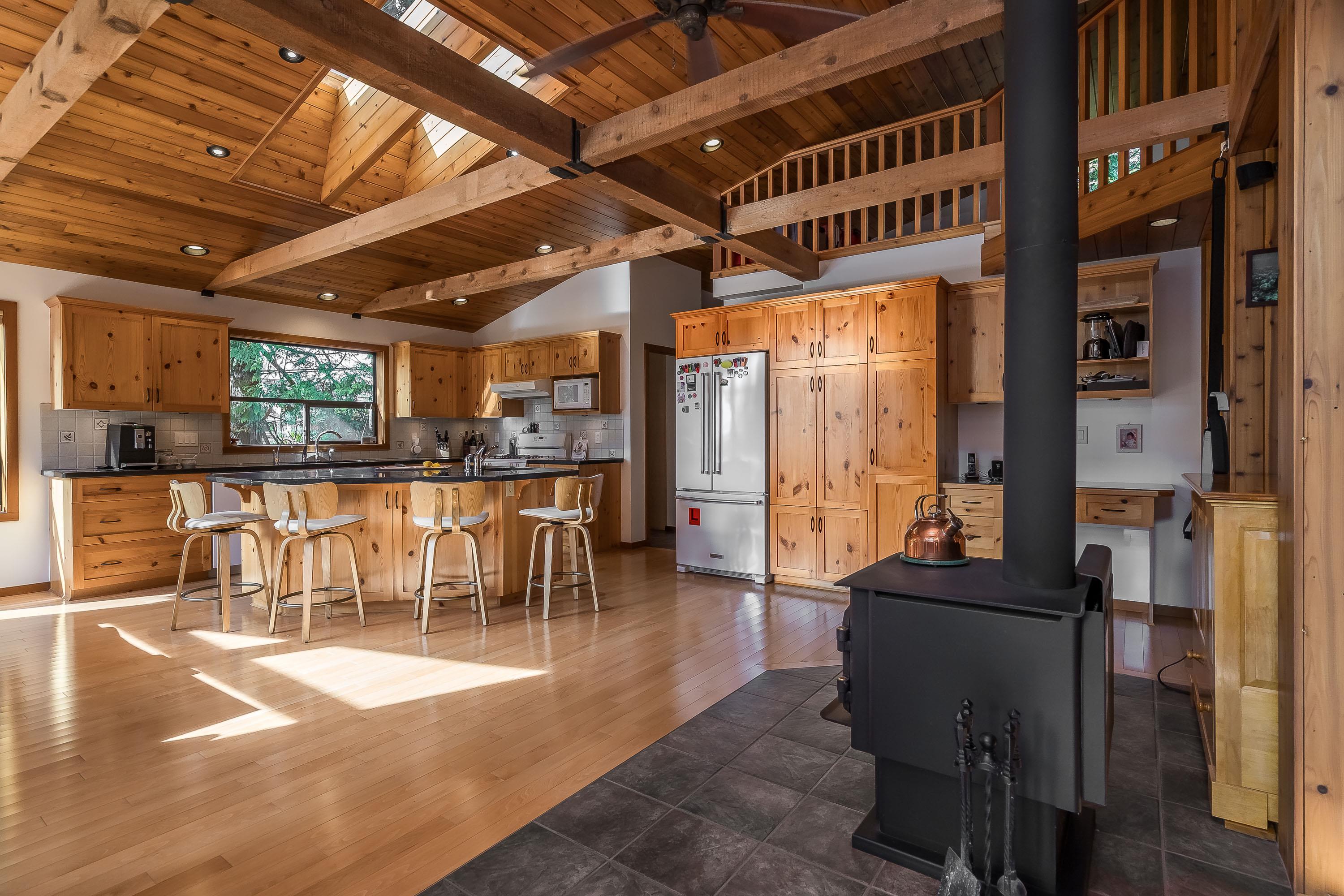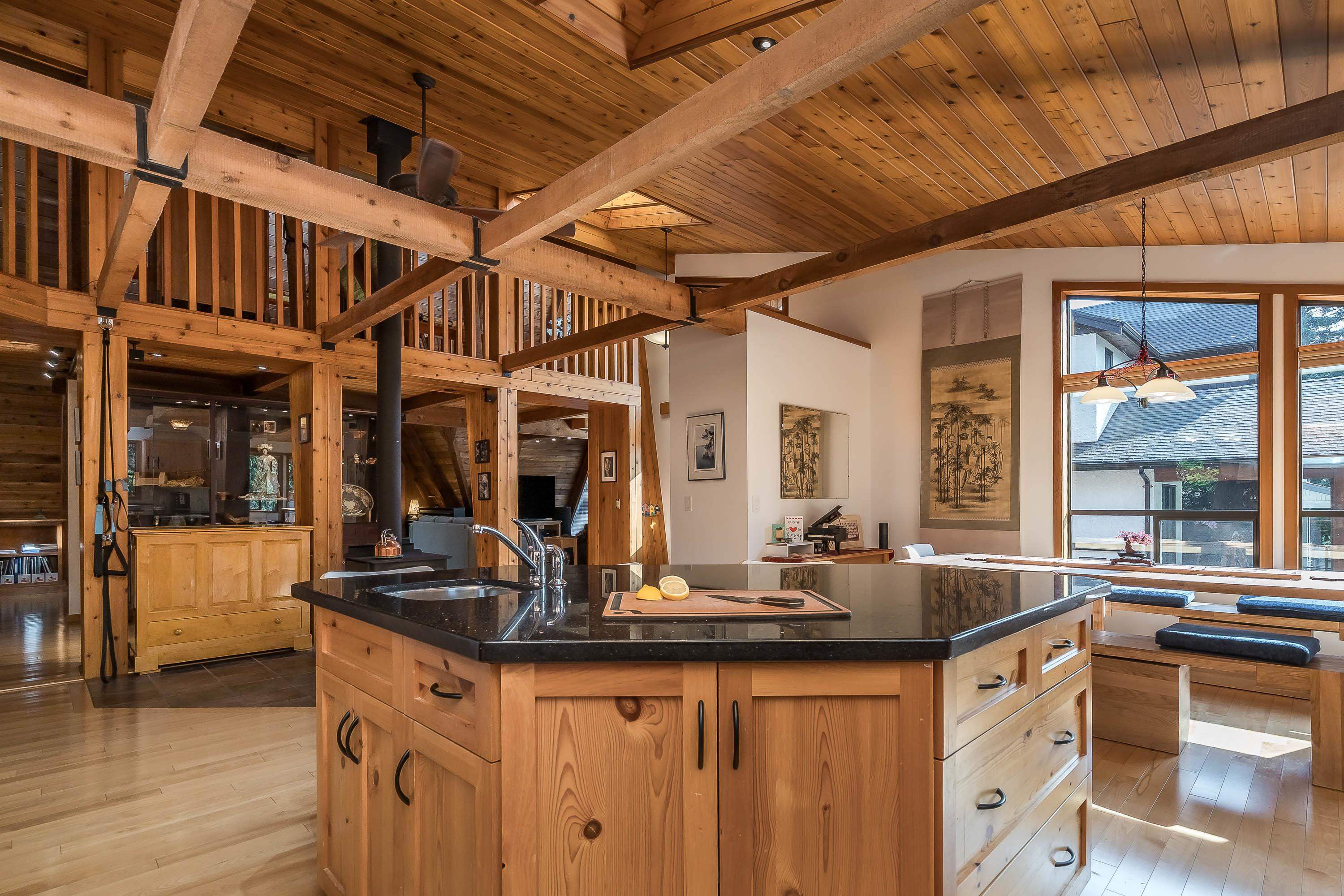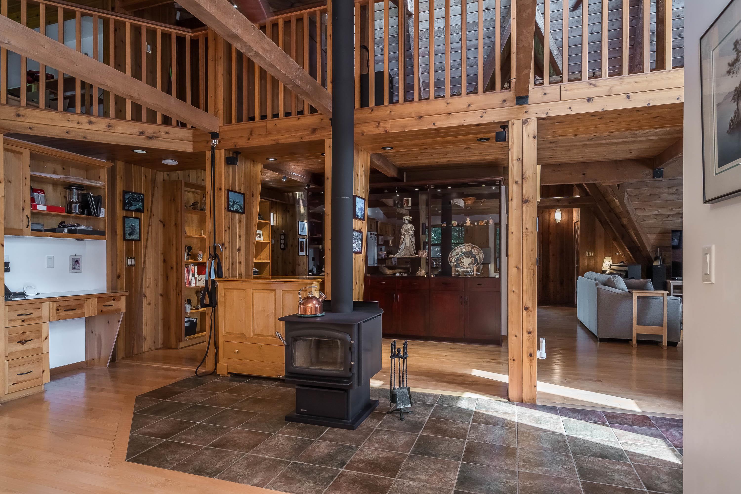 Experience West Coast living at its finest in this breathtaking timber-frame home. Soaring vaulted wood ceilings, exposed beams, and expansive floor-to-ceiling windows create a stunning, airy ambiance flooded with natural light. The open concept layout showcases a spacious kitchen with knotty pine cabinetry and a cozy living area anchored by a classic brick fireplace and free-standing wood stove. Offering 3 bedrooms plus office, 3 baths, and a private 1-bedroom in-law suite with separate laundry. Enjoy seam...