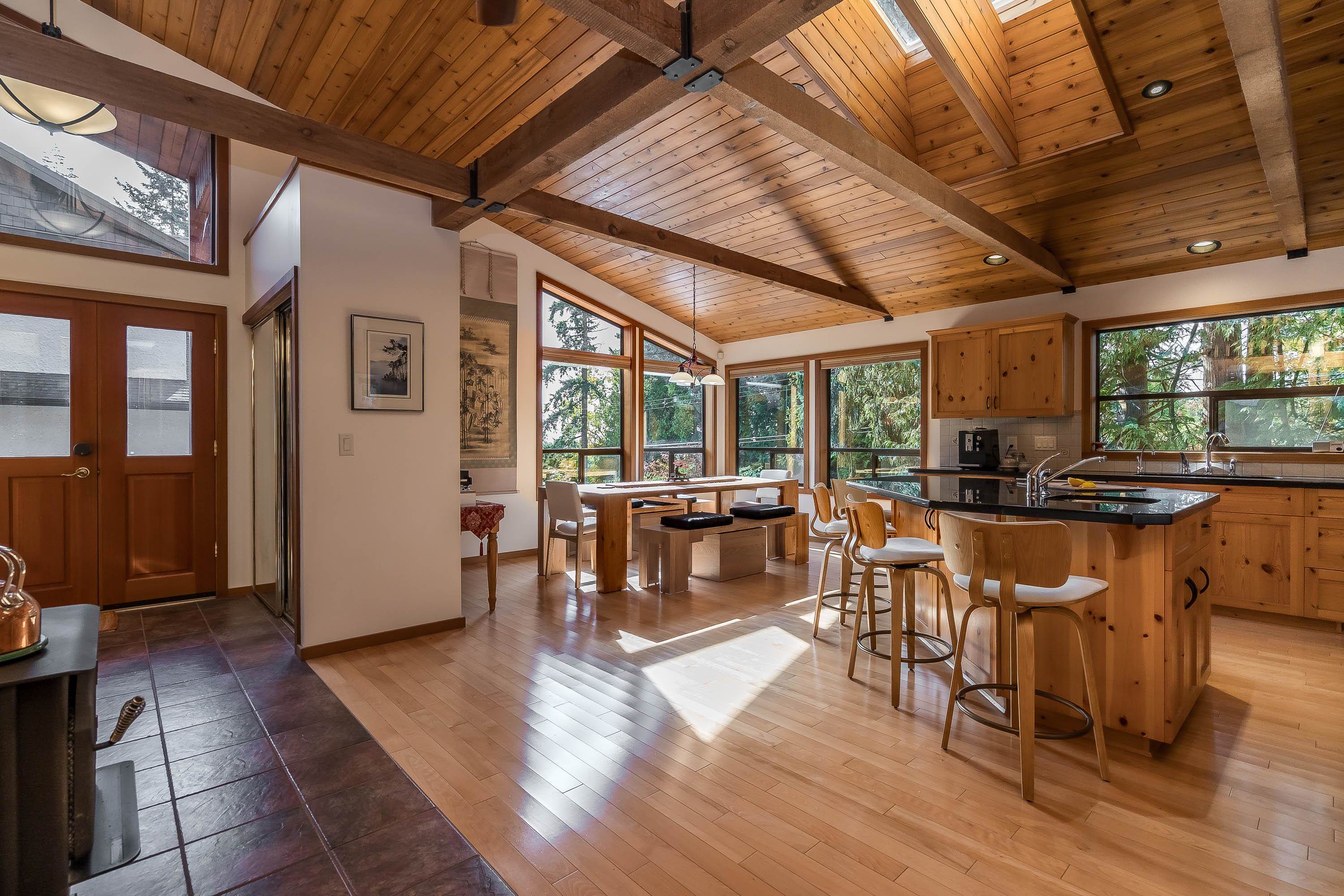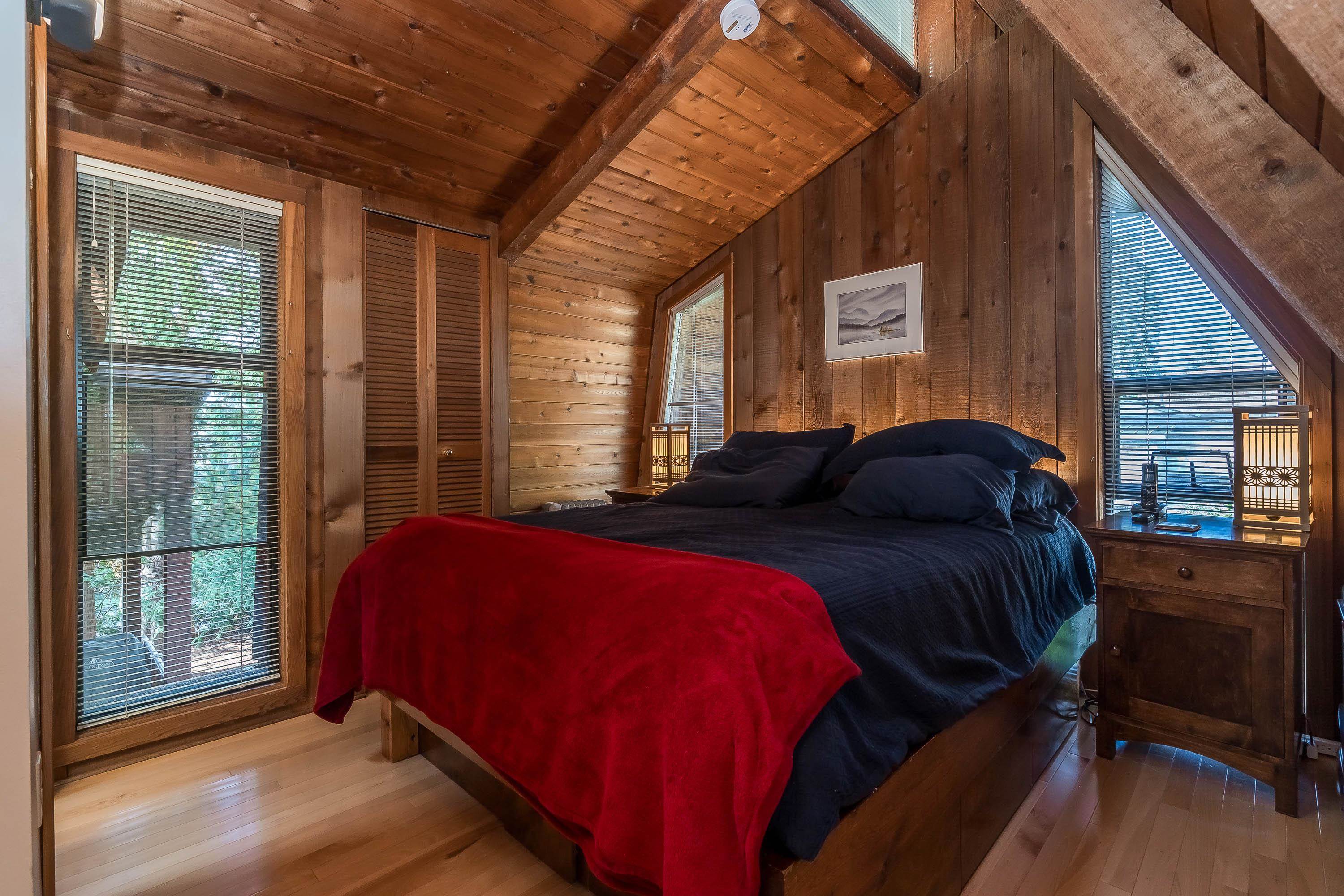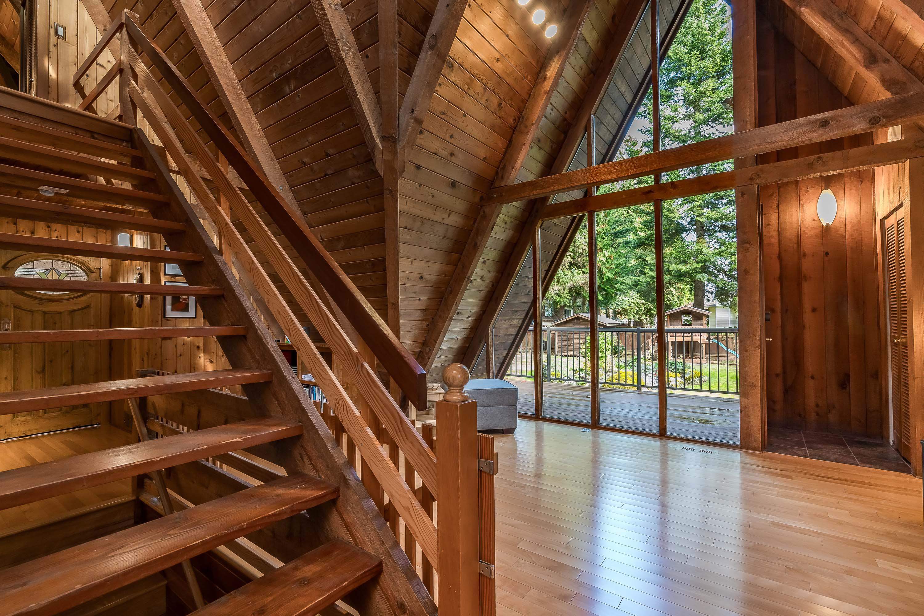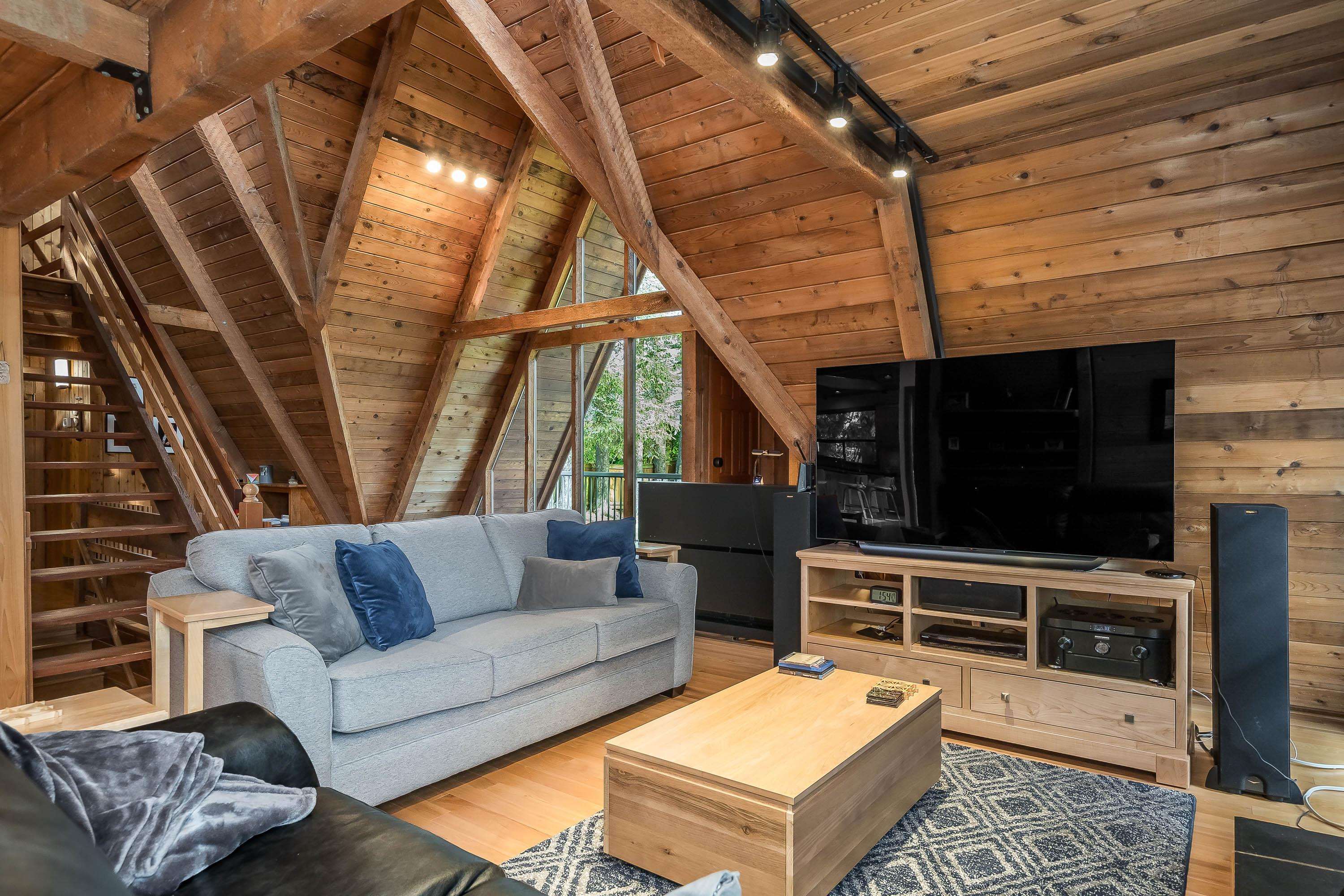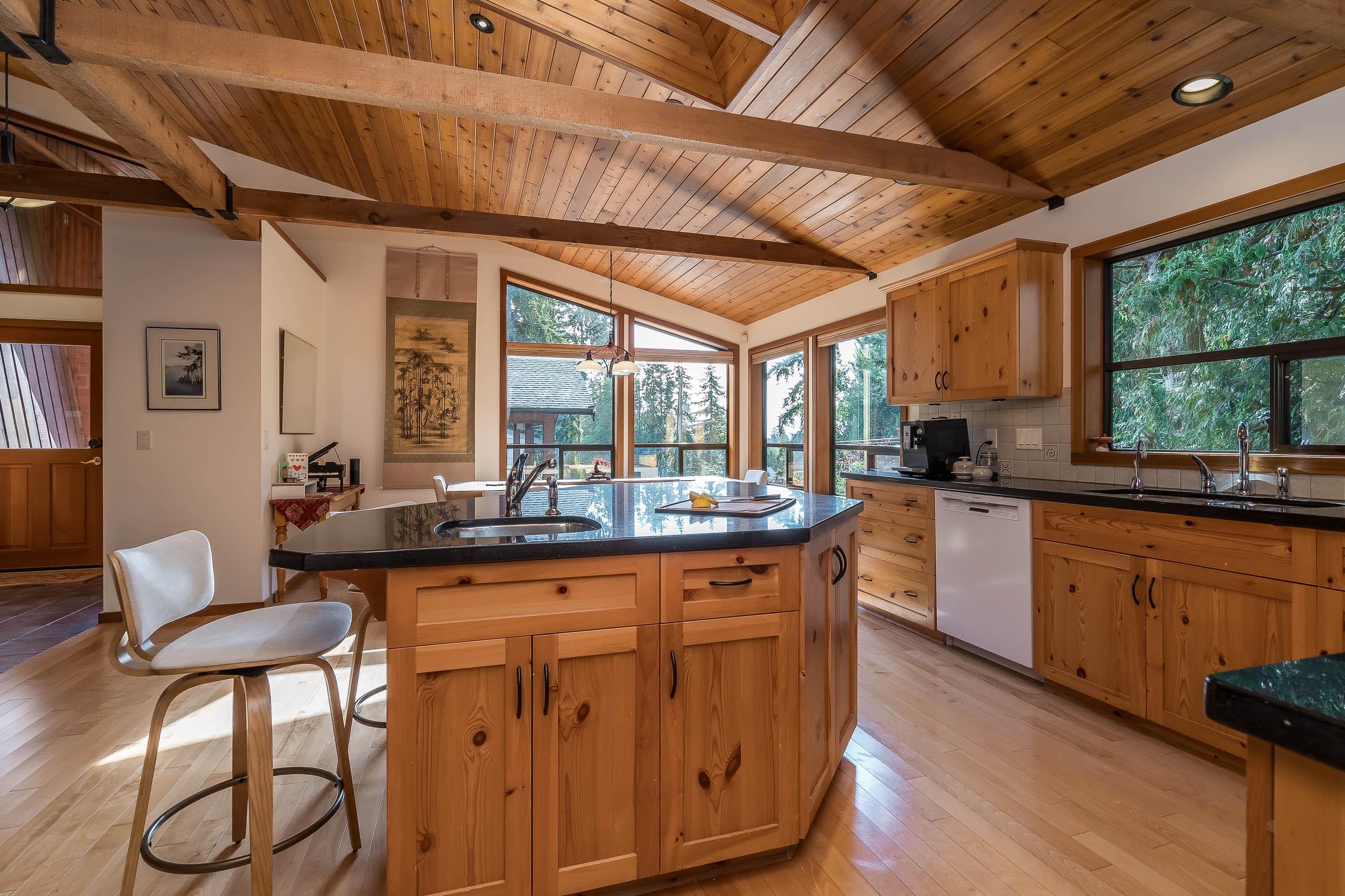 Experience West Coast living at its finest in this breathtaking timber-frame home. Soaring vaulted wood ceilings, exposed beams, and expansive floor-to-ceiling windows create a stunning, airy ambiance flooded with natural light. The open concept layout showcases a spacious kitchen with knotty pine cabinetry and a cozy living area anchored by a classic brick fireplace and free-standing wood stove. Offering 3 bedrooms plus office, 3 baths, and a private 1-bedroom in-law suite with separate laundry. Enjoy seam...