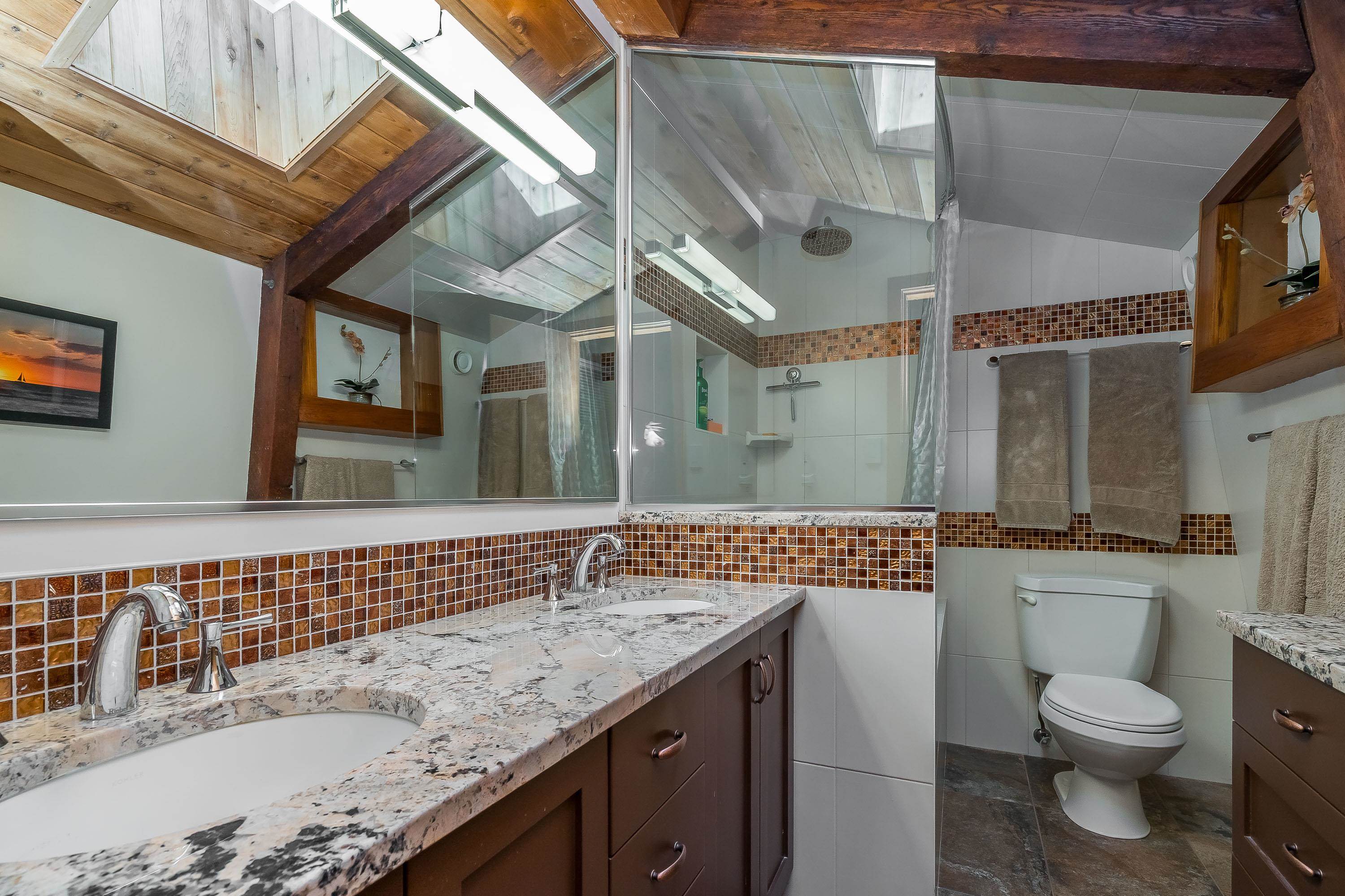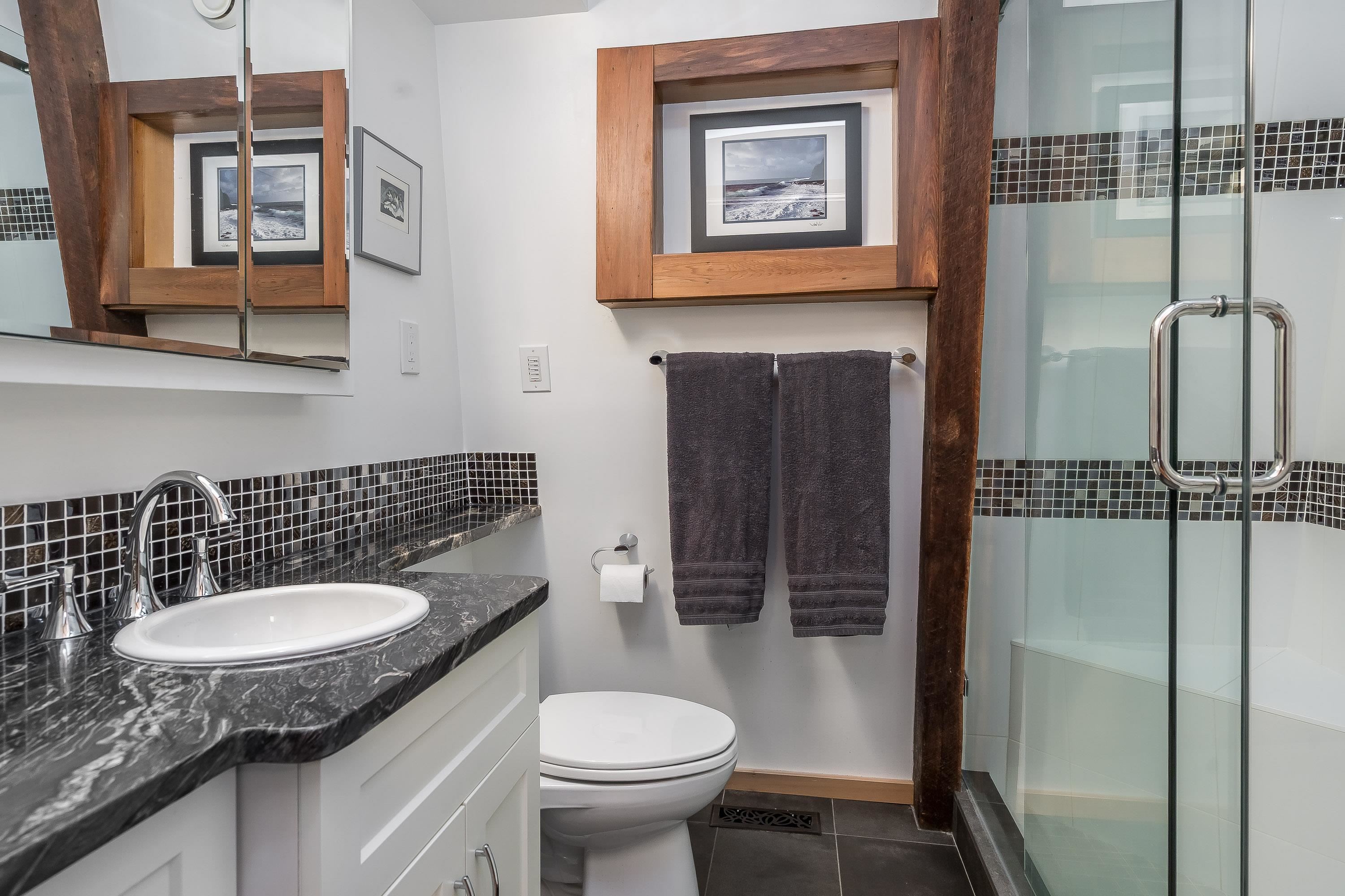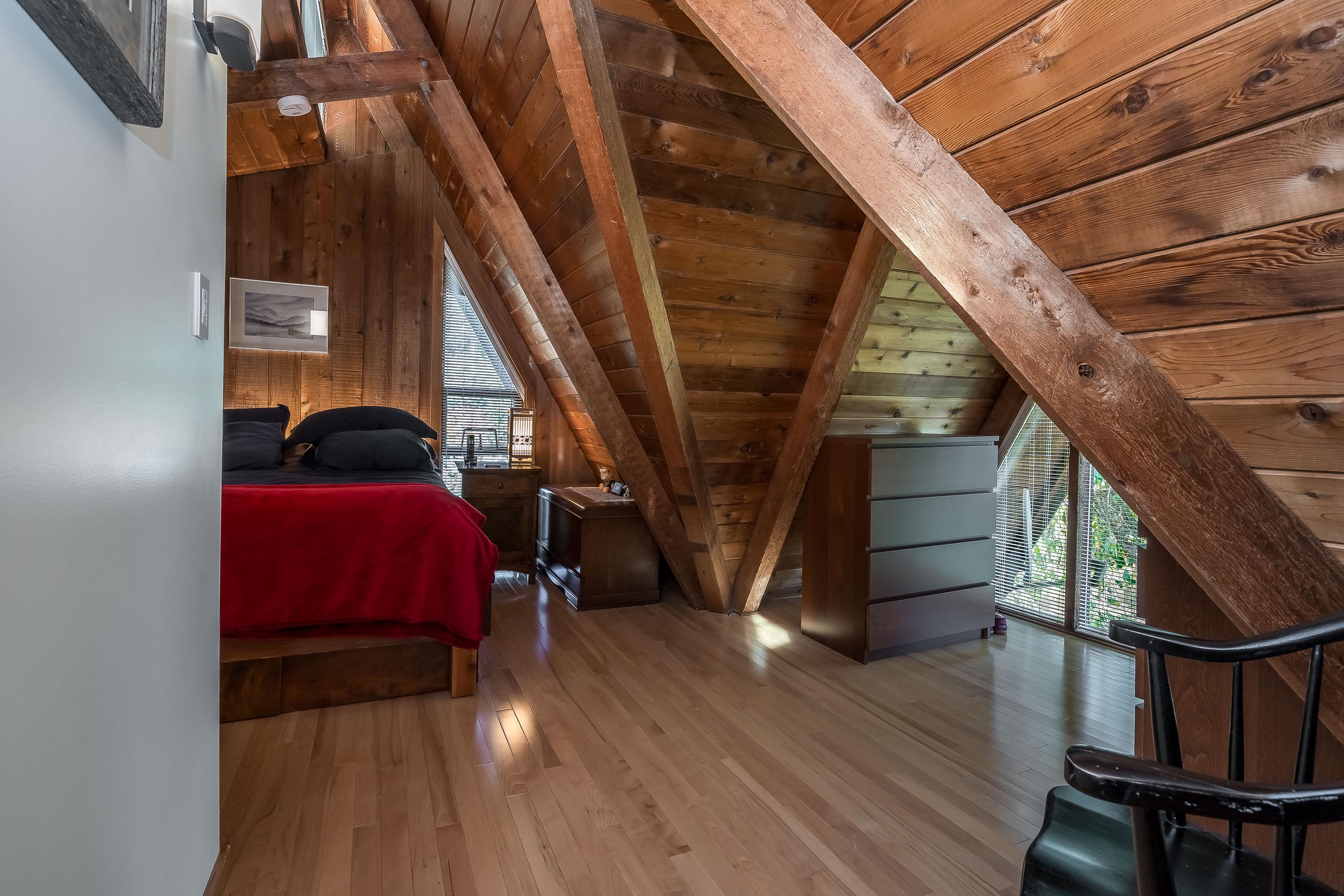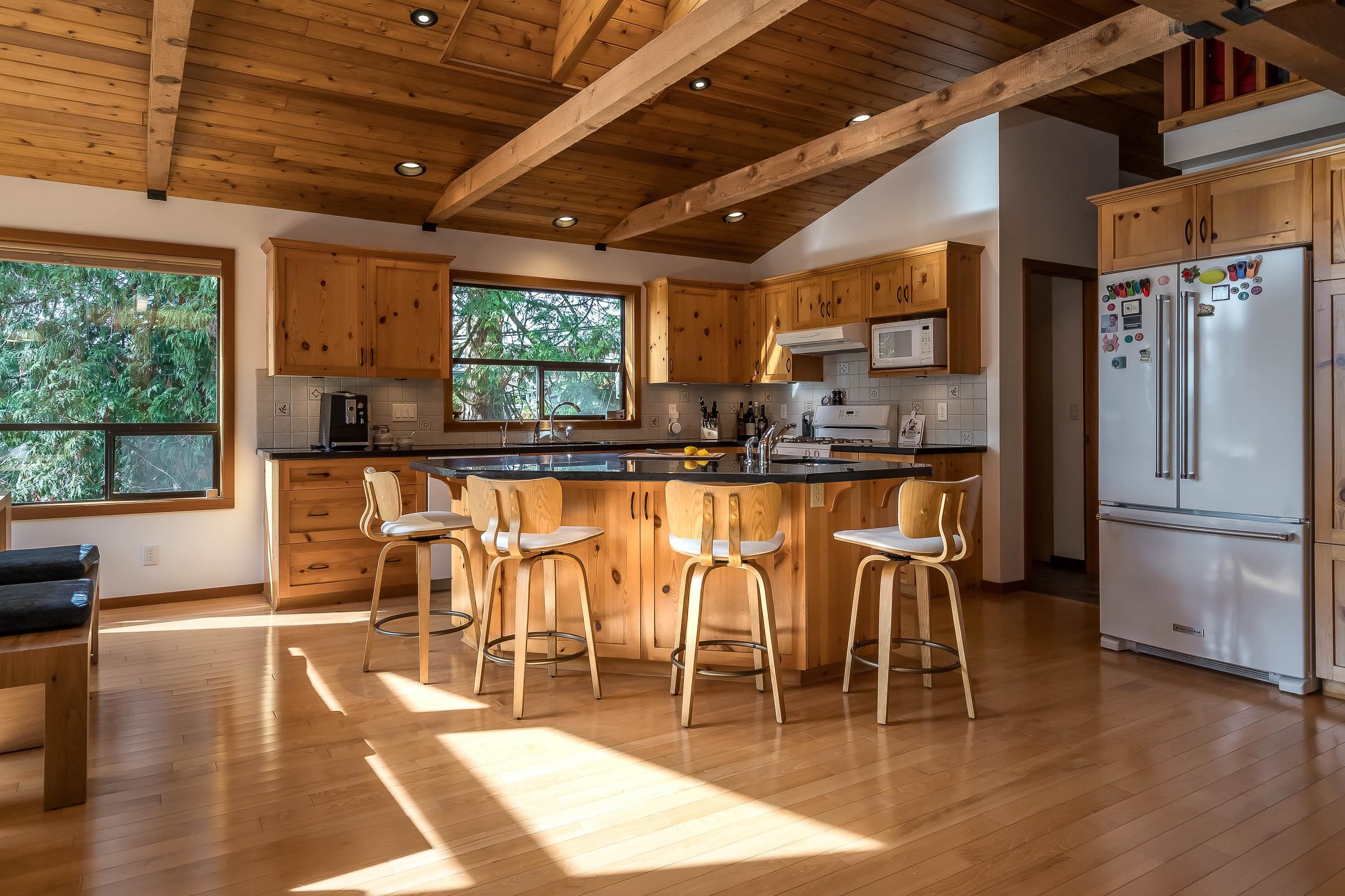 Experience West Coast living at its finest in this breathtaking timber-frame home. Soaring vaulted wood ceilings, exposed beams, and expansive floor-to-ceiling windows create a stunning, airy ambiance flooded with natural light. The open concept layout showcases a spacious kitchen with knotty pine cabinetry and a cozy living area anchored by a classic brick fireplace and free-standing wood stove. Offering 3 bedrooms plus office, 3 baths, and a private 1-bedroom in-law suite with separate laundry. Enjoy seam...