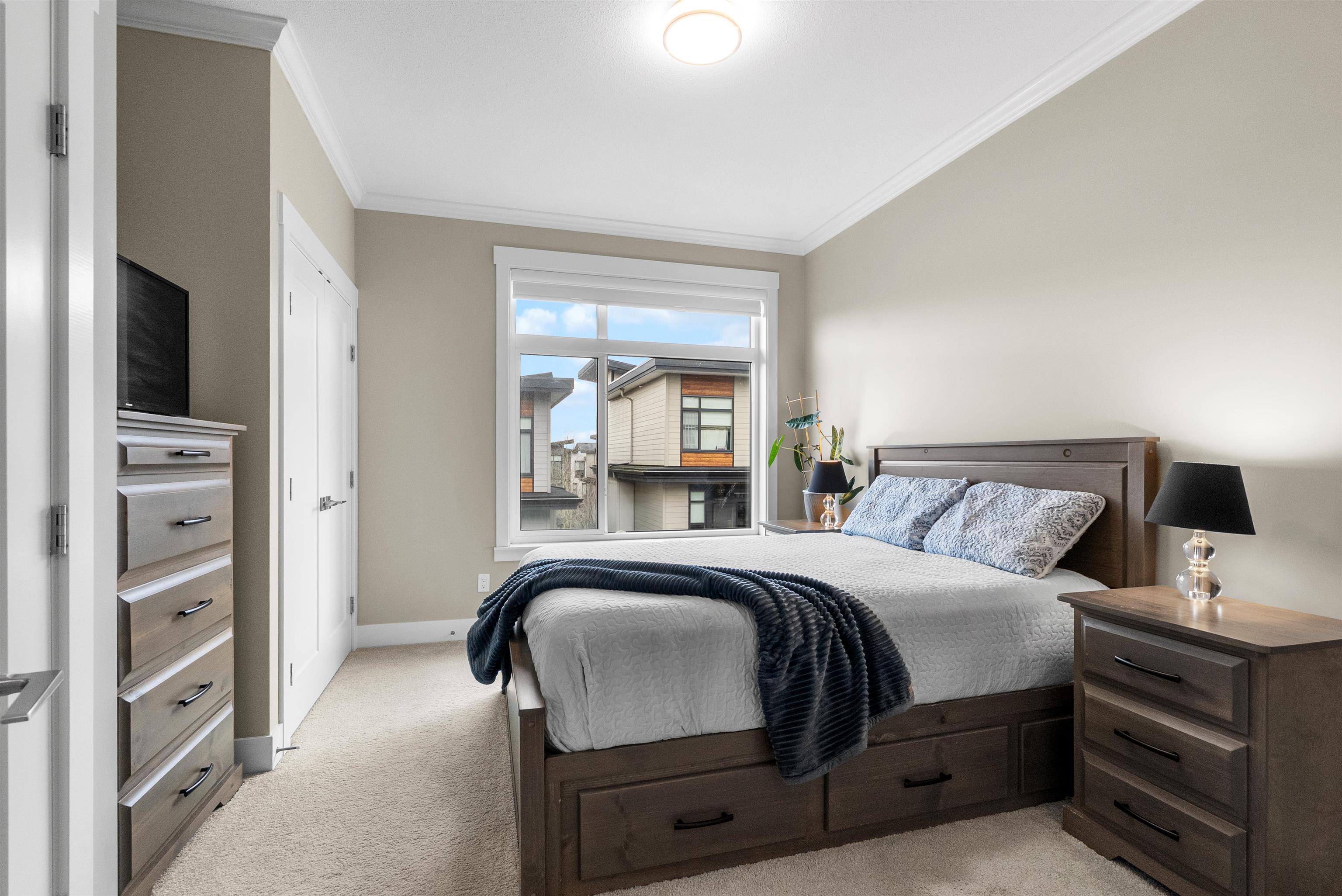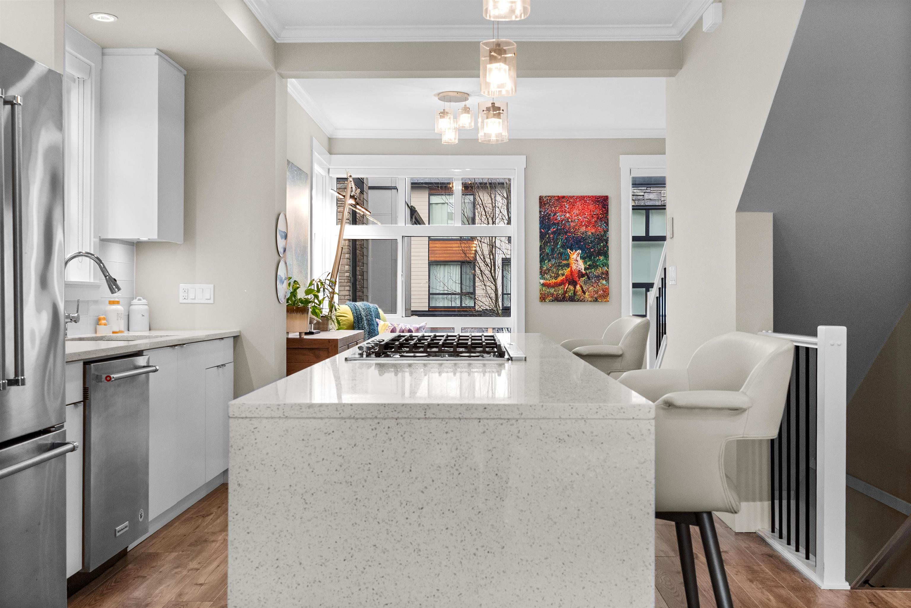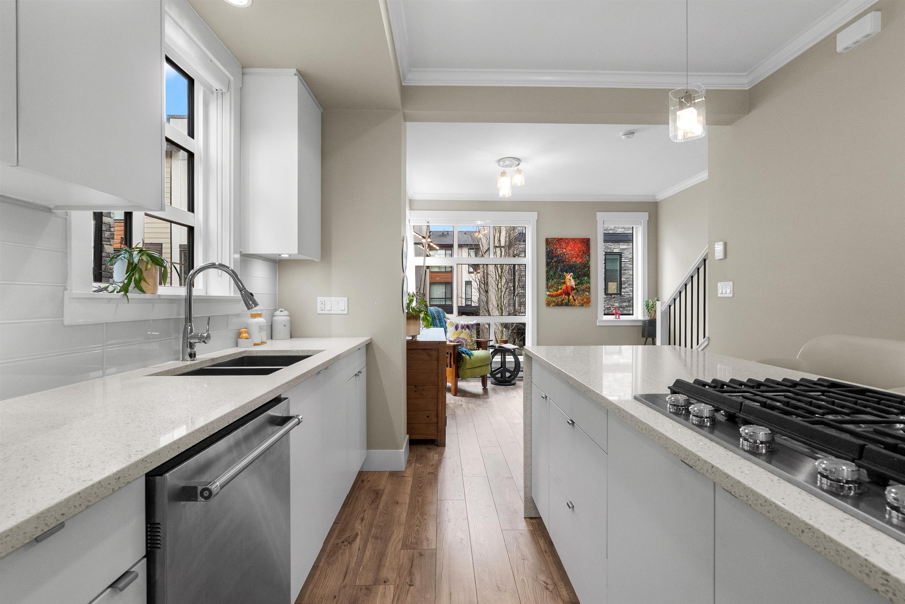 Beautifully maintained end unit at Harvest at Bose Ridge Farm in West Cloverdale! The open concept living space features a gourmet kitchen with quartz countertops, modern cabinetry, stainless steel appliances, gas cooktop, and a striking waterfall island, perfect for everyday living and entertaining. 9 foot ceilings and floor to ceiling windows create a bright, airy feel throughout. A versatile flex room/den welcomes you at the entry while the upstairs offers a generous primary bedroom and the second bedr...