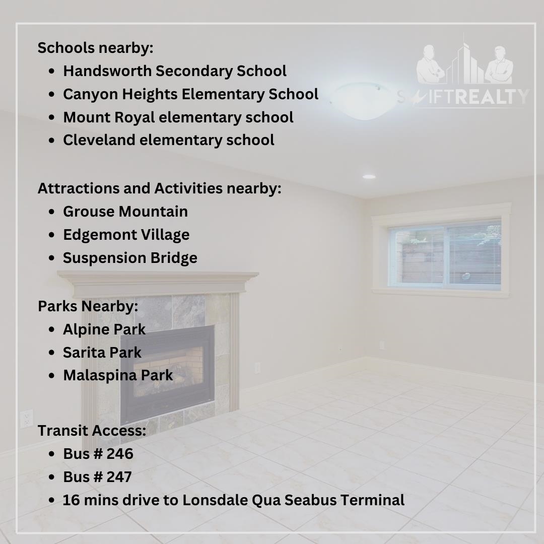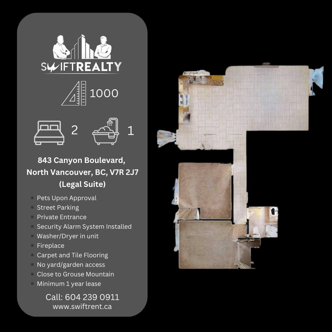 Welcome to Canyon Heights in North Vancouver! This spacious 2 Bed, 1 Bath suite offers 1,000 sq. ft. of comfortable living with a private entrance and a cozy fireplace. The kitchen is fully equipped with a dishwasher, garburator, stove, and fridge for added convenience. The suite features carpet and tile flooring, in-suite washer/dryer, a security alarm system, and street parking. Pets may be considered upon approval. Please note there is no yard or garden access. LOCATION: Ideally situated near Grouse M...