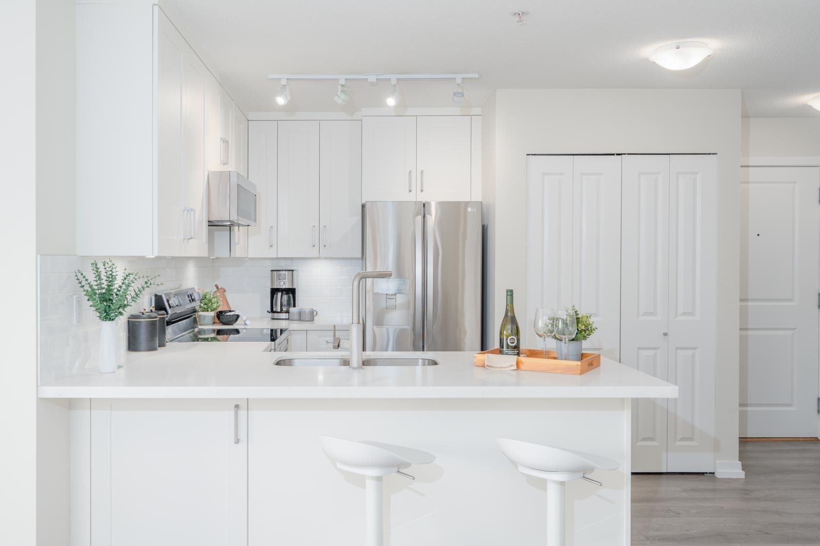 Top-floor, renovated (Over 40K in upgrades) corner unit at The Grove! This bright 2-bed, 2-bath home offers a beautiful kitchen with slow-close cabinetry, Caesarstone quartz counters, new appliances, wide plank flooring, and updated bathrooms. Spacious cross-hall layout with a large covered balcony and peaceful creekside views. Includes 2 parking stalls. One of the best units in the complex - private, stylish, and steps from shopping, schools, and transit. Move-in ready with top-quality upgrades! Perfect fo...