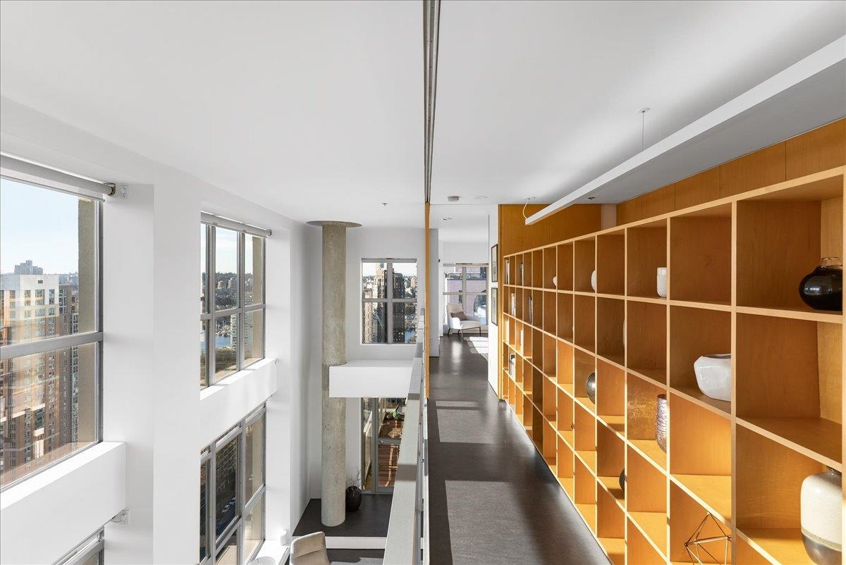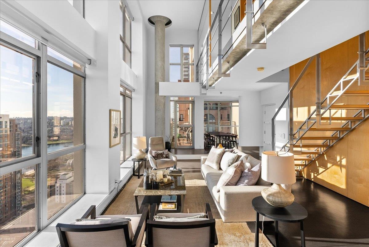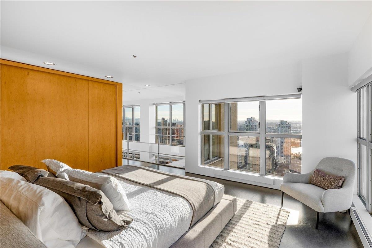 World Class Penthouse at The Metropolis. Designed by renowned architect Peter Cardew. This is true piece of architectural history. The home blends smooth concrete and glass with organic metals and warm wood accents. Soaring 18 foot ceilings frame stunning city, mountain, and water views. The open concept layout features a large offset kitchen ideal for entertaining. A mezzanine walkway separates two bedrooms and a flexible space perfect for a home office or retreat. The spa inspired ensuite offers an oversi...