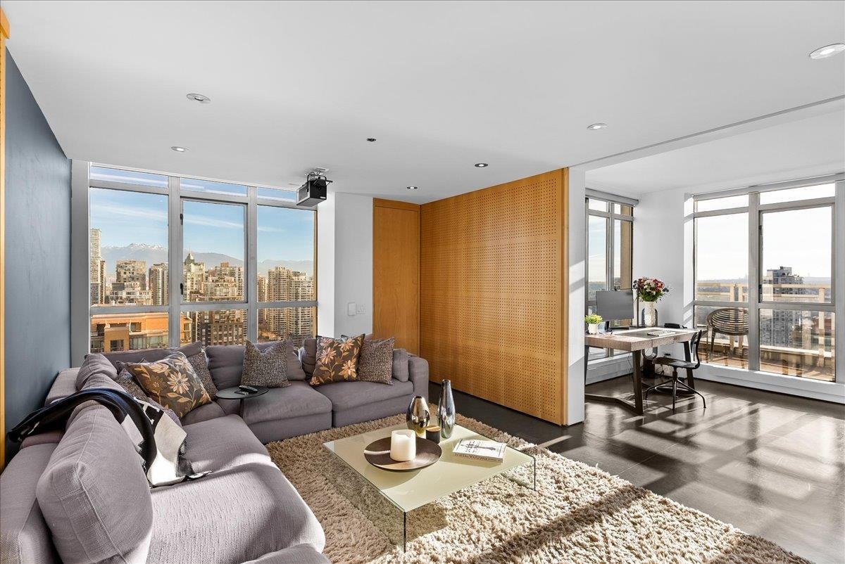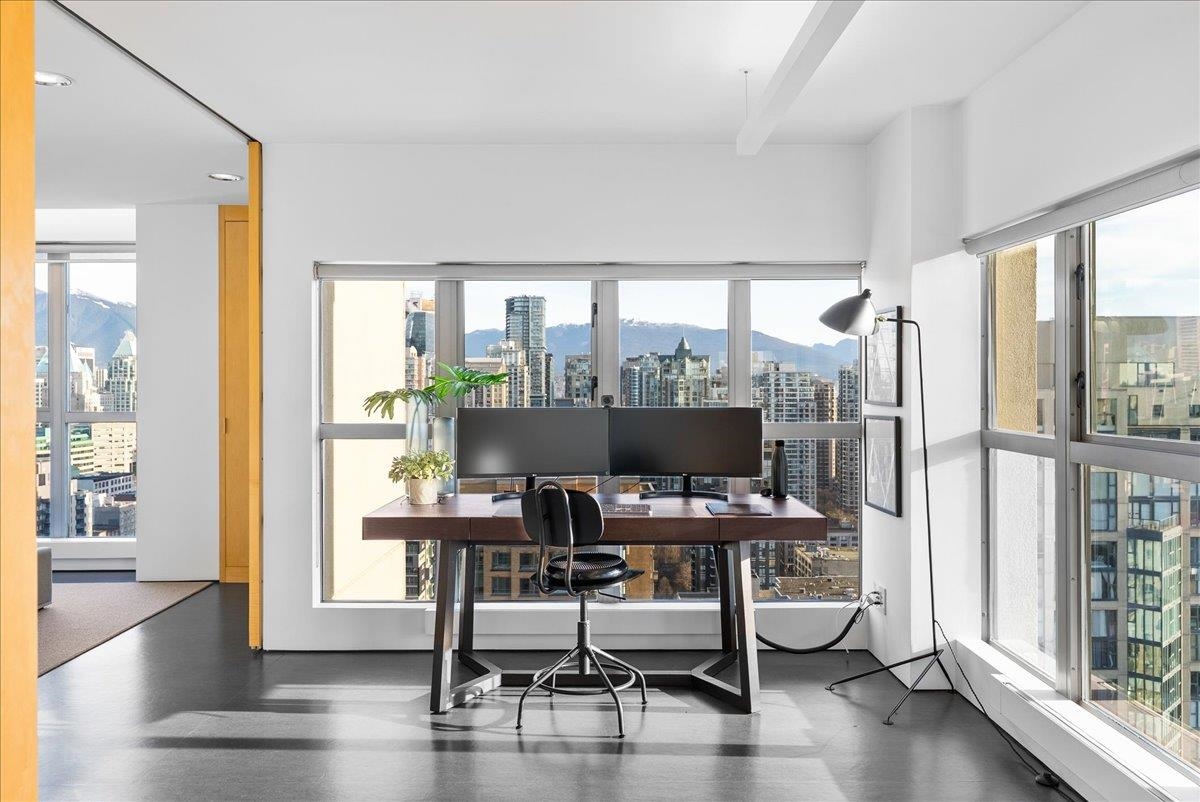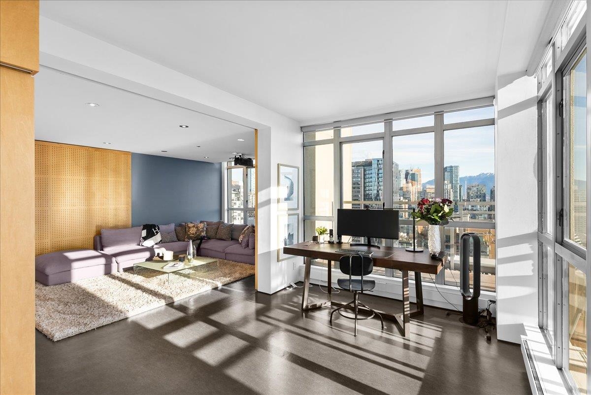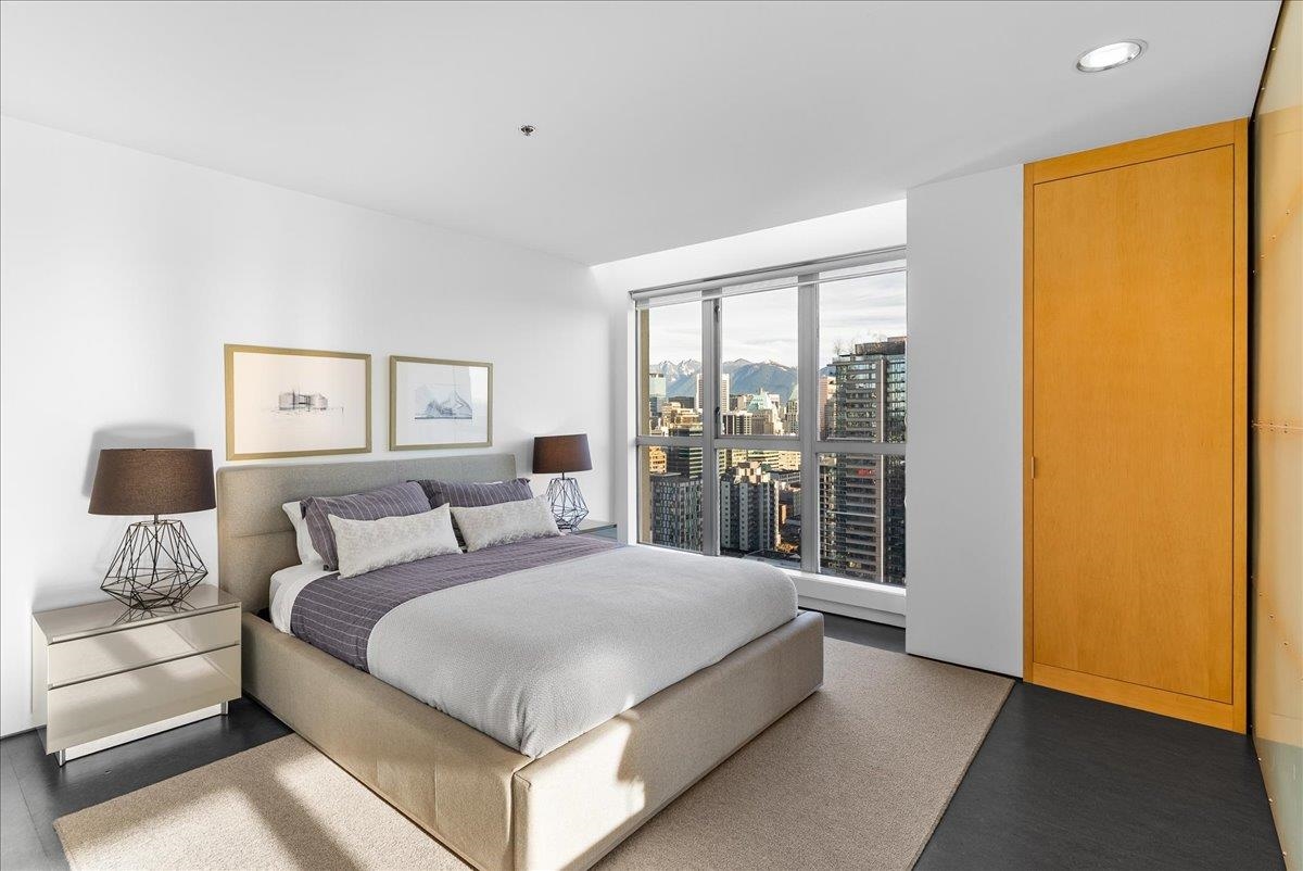 World Class Penthouse at The Metropolis. Designed by renowned architect Peter Cardew. This is true piece of architectural history. The home blends smooth concrete and glass with organic metals and warm wood accents. Soaring 18 foot ceilings frame stunning city, mountain, and water views. The open concept layout features a large offset kitchen ideal for entertaining. A mezzanine walkway separates two bedrooms and a flexible space perfect for a home office or retreat. The spa inspired ensuite offers an oversi...