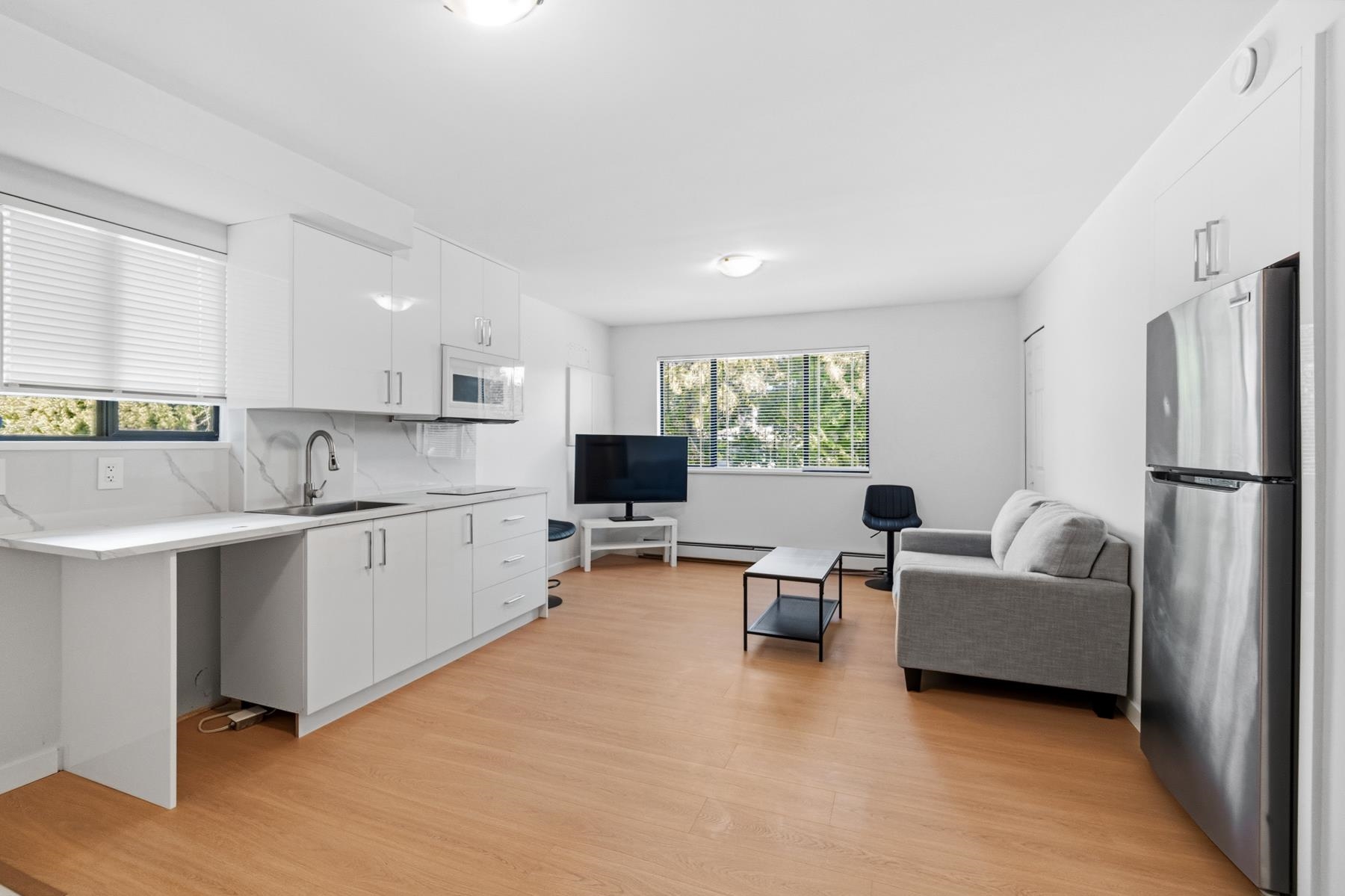 Fully furnished short term or long term. More furniture, dishwasher and laundry will be provided soon. Fully renovated ground-level studio in the desirable Upper Lonsdale neighbourhood on St. Andrews Avenue. This bright East-facing home offers approximately 450 sq.ft. of interior living space and is available ASAP. The suite features a brand-new kitchen, updated bathroom, new flooring, fresh paint, and modern finishes throughout, and has not been occupied since renovation. Dishwasher and in-suite laundry wi...